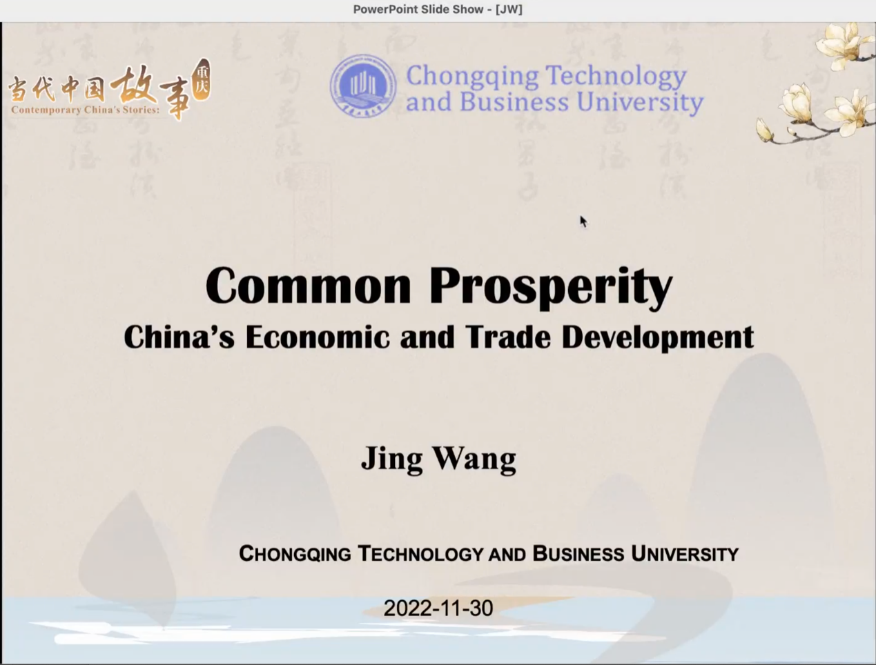 为积极贯彻落实党的二十大关于“向世界讲好中国故事”的号召,2022年11月30日下午3:00,“缙云知华”大讲坛专家讲座第十二期在重庆工商大学成功举办,主题为“共同富裕—中国经济与贸易发展”,讲座由重庆工商大学经济学院王静副教授主讲,国际合作与交流处处长张轶主持。受疫情影响,讲座以线上形式展开,重庆工商大学国际学生和部分中国学生代表、在渝其他高校国际学生通过腾讯会议线上参加讲座。