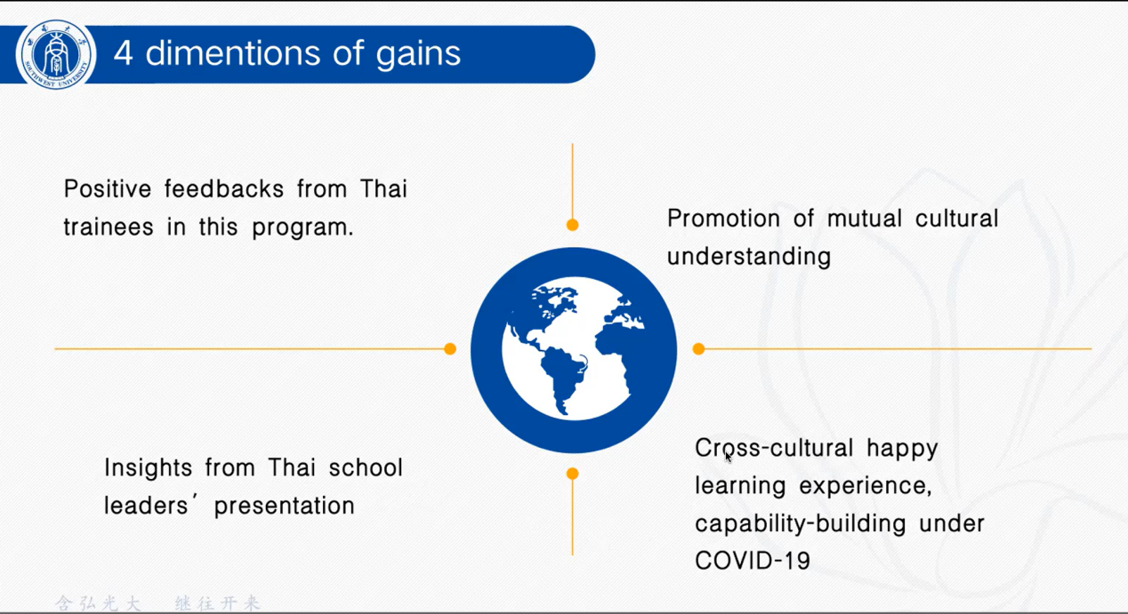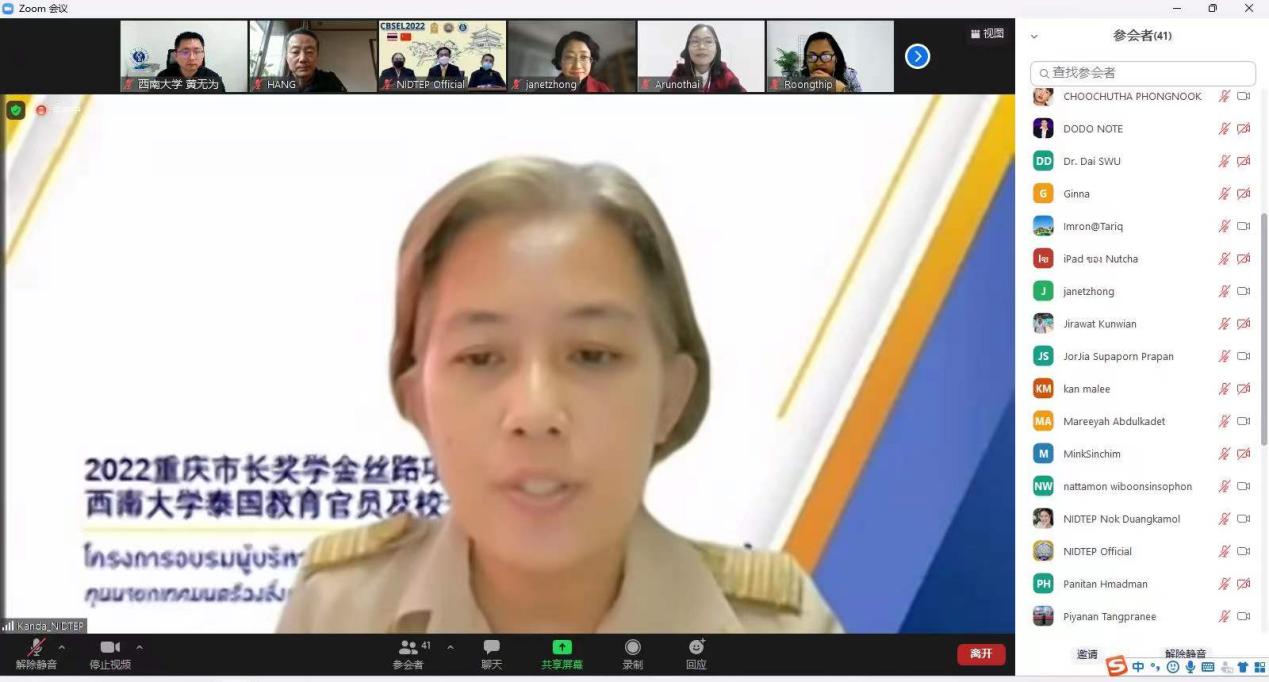 钟婉娟副教授就本次培训的前期筹备、实施过程、培训成果等做总结。表示,此次培训项目共有四个方面的收获:一是收获了泰方学员对于项目学习内容的积极评价;二是促进了中方授课教师及重庆中小学校长对于泰国教育实践的进一步理解;三是加深了双方文化交流与理解;四是提升了必赢776net项目培训团队在疫情期间进行跨文化在线全英文实施培训项目的能力。强调,此次项目的圆满成功得益于学校与泰国NIDTEP双方领导的高度重视,得益于项目授课团队专家的高质量教学及项目支持团队成员专业的项目服务。