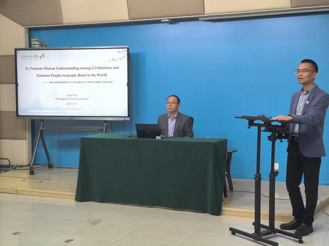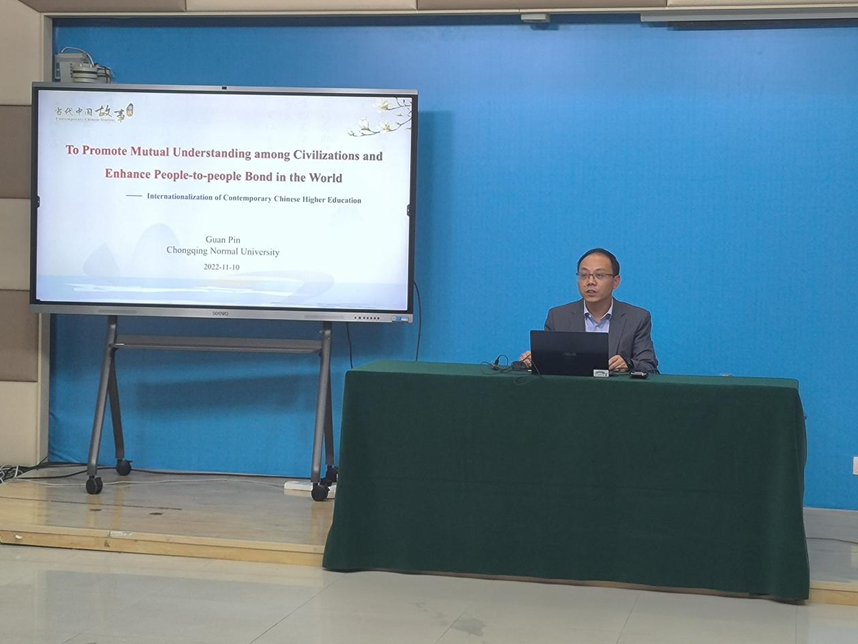 为了积极贯彻落实党的二十大关于“向世界讲好中国故事”的号召,2022年11月10日,“缙云知华”大讲坛专家讲座第十一期在重庆师范大学田家炳书院6407室成功举办,主题为“促进民心相通,助力文明互鉴—当代中国高等教育国际化”,讲座由重庆师范大学国际合作与交流处官品副教授主讲,国际合作与交流处查直处长主持,在渝高校国际学生、港澳台学生代表及境外国际学生近200人通过腾讯会议线上观看。