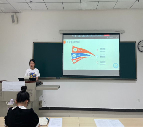 学院研究生会主席团成员彭关奇及刘豪妍汇报本学期各项工作成果,回顾工作中存在的不足之处,并提出研究生会未来工作的努力方向。随后,各部门负责人进行述职,就部门概要、工作总结、不足与反思三个部分进行阐述。
