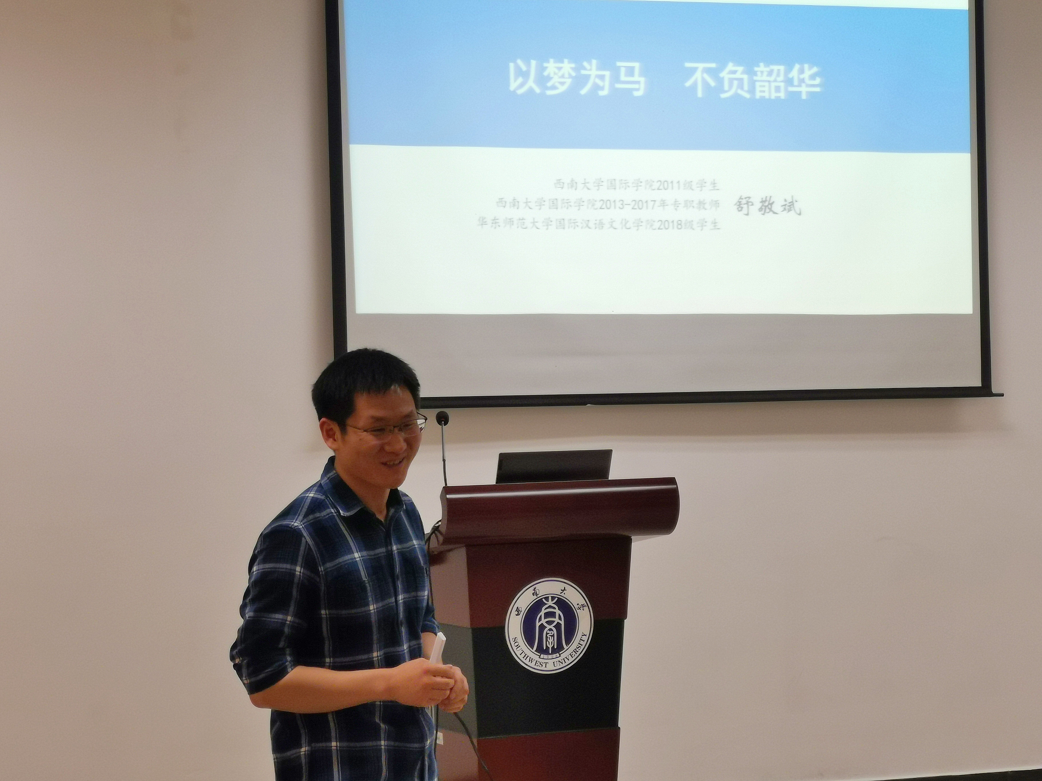 2021年4月29日,必赢776net“缙云知华大讲坛”第五期学术沙龙在紫云楼317教室如期举行。本次沙龙邀请到必赢776net汉语国际教育2011级硕士毕业生、华东师范大学汉语国际教育博士研究生舒敬斌主讲,学院部分教师代表、2020级博士研究生及在校中国研究生全程参与。讲座由汉语国际教育系主任杨甜副教授主持