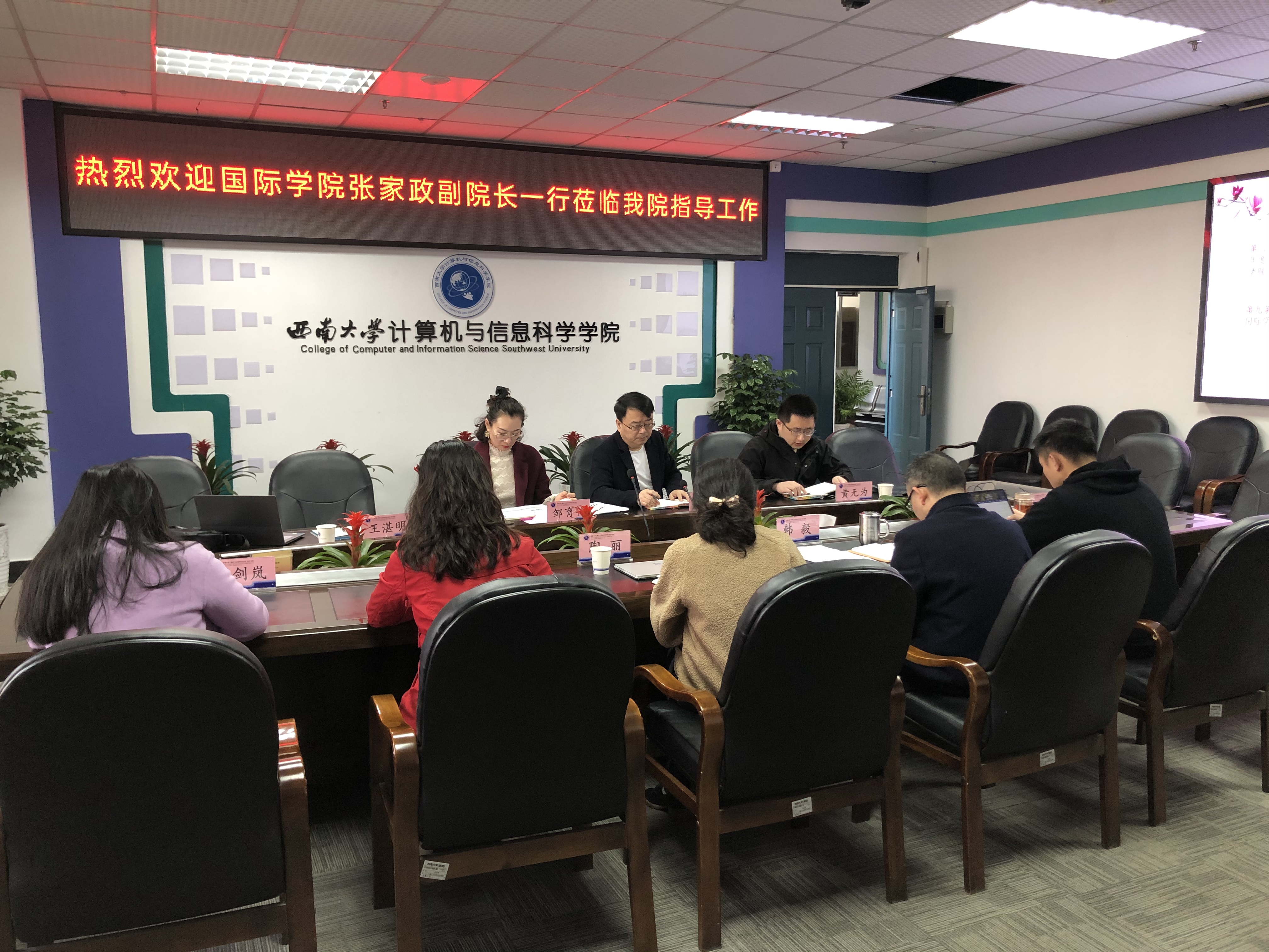 为加强与二级培养单位的沟通与联系,进一步做好来华留学教育工作, 3月24上午,副院长张家政带领学院招生办、教学办、学工办有关工作人员前往计算机与信息科学学院/软件学院调研,计算机与信息科学学院/软件学院副院长韩毅、副院长陶丽、副书记陈智和有关辅导员、外事秘书、教学秘书等参与座谈交流。