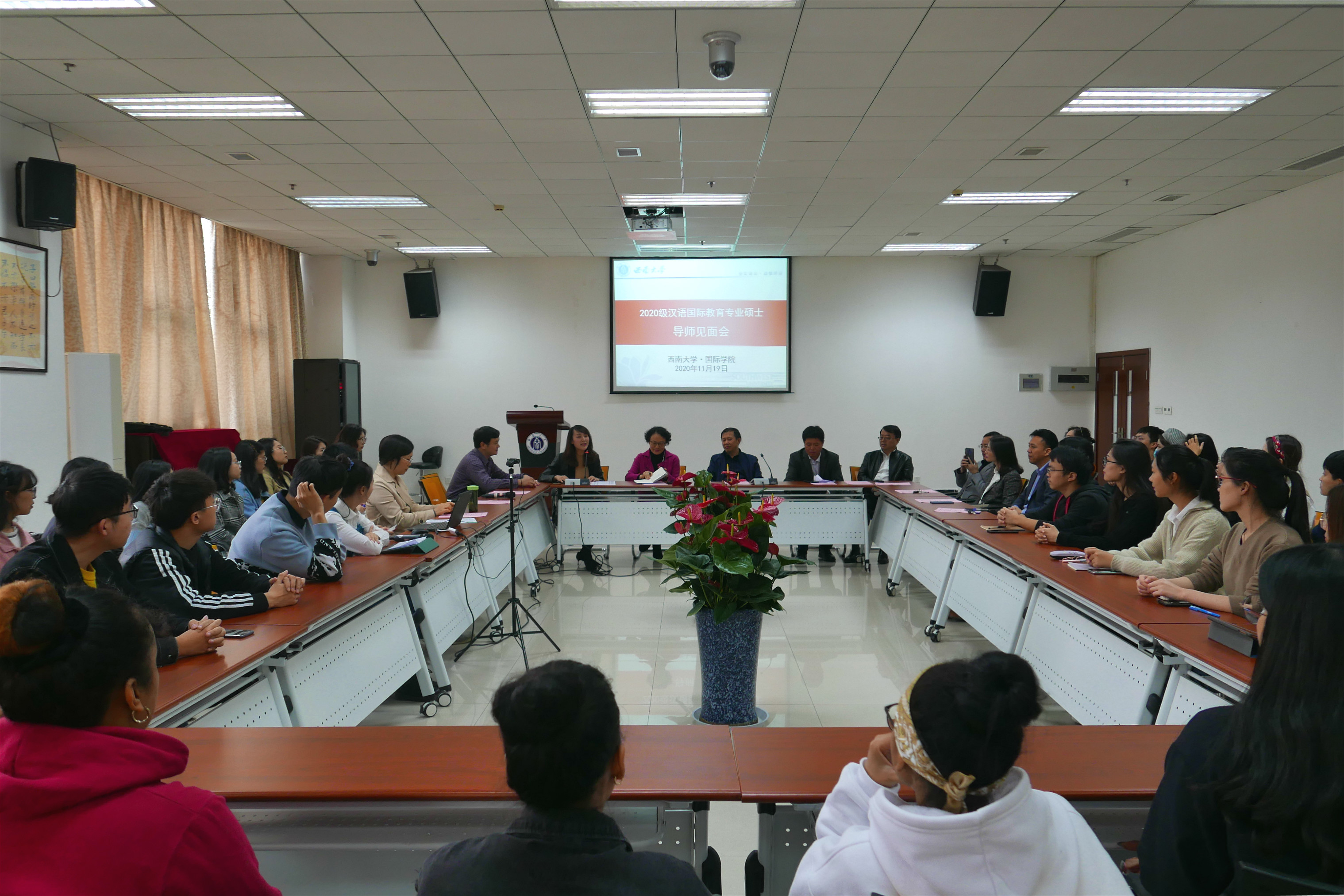 冉冉晨雾重,晖晖冬日微。2020年11月19日下午,紫云楼317教室举行了2020级汉语国际教育专业硕士导师见面会,境外的国际学生同步线上参会。