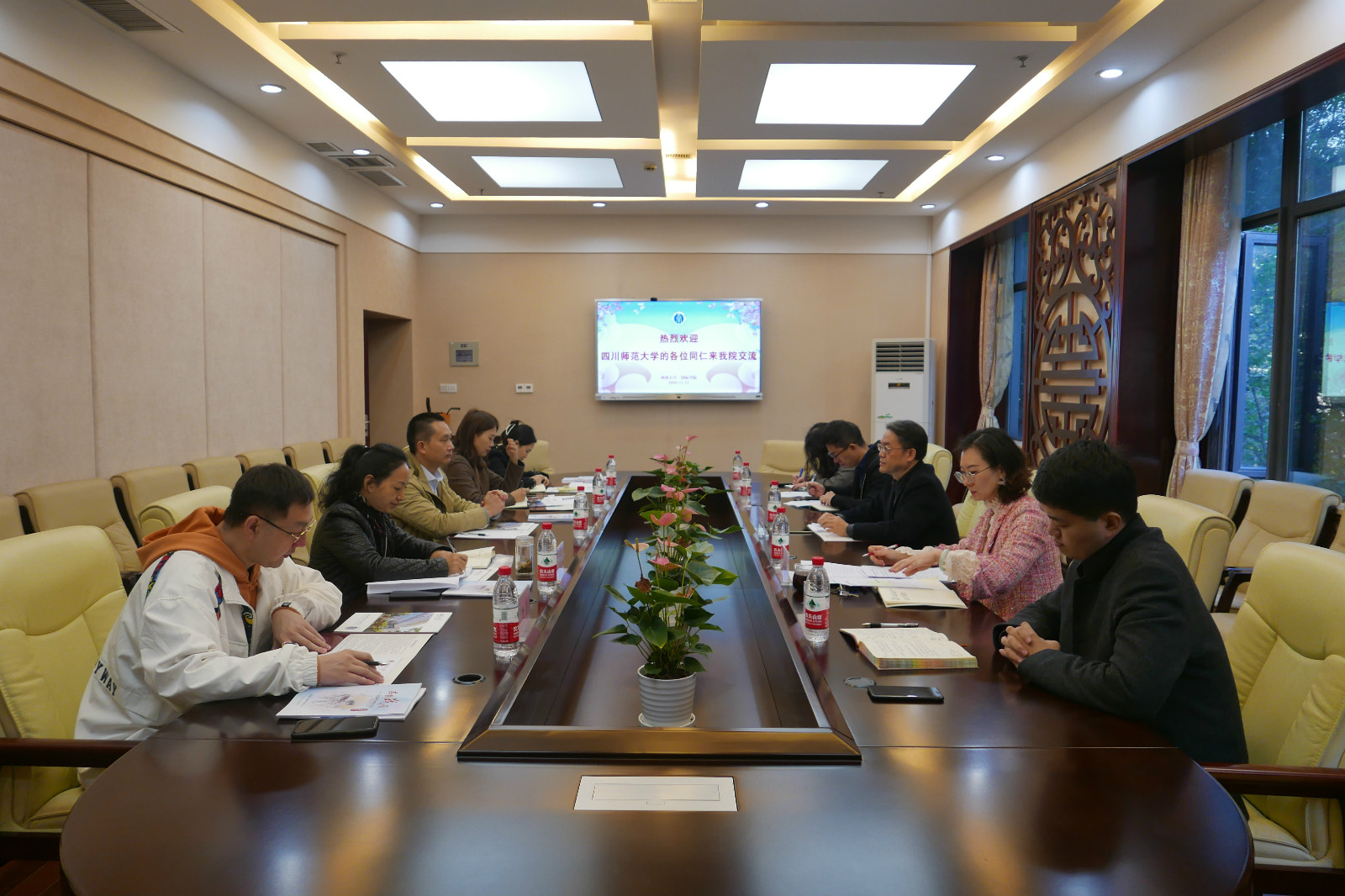 11月11日上午,四川师范大学国际教育学院院长汤洪、副院长张春兰等一行5人来学院考察交流,调研国际学生招生、管理、教学、HSK考务等工作,刘猛书记、刘承宇院长和相关科室负责人在紫云楼签约室与客人进行座谈交流。