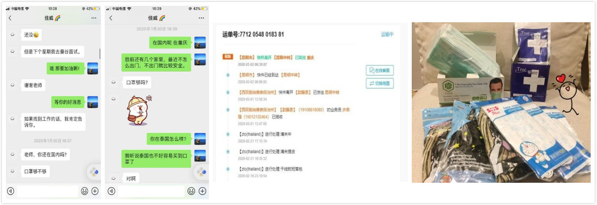 1月30日,她突然在微信上问我口罩够不够,中国情况怎么样?我说我在家不出门还是挺安全的,让她别担心。过了几天,她还是不放心,又来问我,缺不缺口罩,我说周围朋友缺一些,如果泰国还能买到的话,请她帮忙买一些,我们付钱给她。她马上说,她不要钱,她是要送给我们。我坚持要付钱,她却比我更坚决,说这是回报老师过去几年的关心和照顾。一个月后,我陆续收到了她从泰国寄给我的口罩,这里面有布口罩,有棉口罩,当然也有真正需要的医用口罩。彼时泰国虽未爆发严重的新冠疫情,但是华人、代购等已经几乎买光了全世界的口罩,可以想象,她跑了多少个商店、药店,才寄来了这100个口罩。