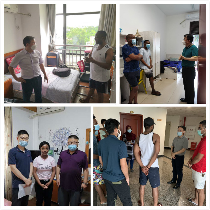 下午,学院领导分四组,逐一看望住在紫云楼、留学生公寓、竹园留学生宿舍的留学生,询问他们在疫情期间的学习、生活情况,嘱咐他们加强防护,多与家人联系,鼓励他们合理利用时间认真学习,取得更好的成绩。
