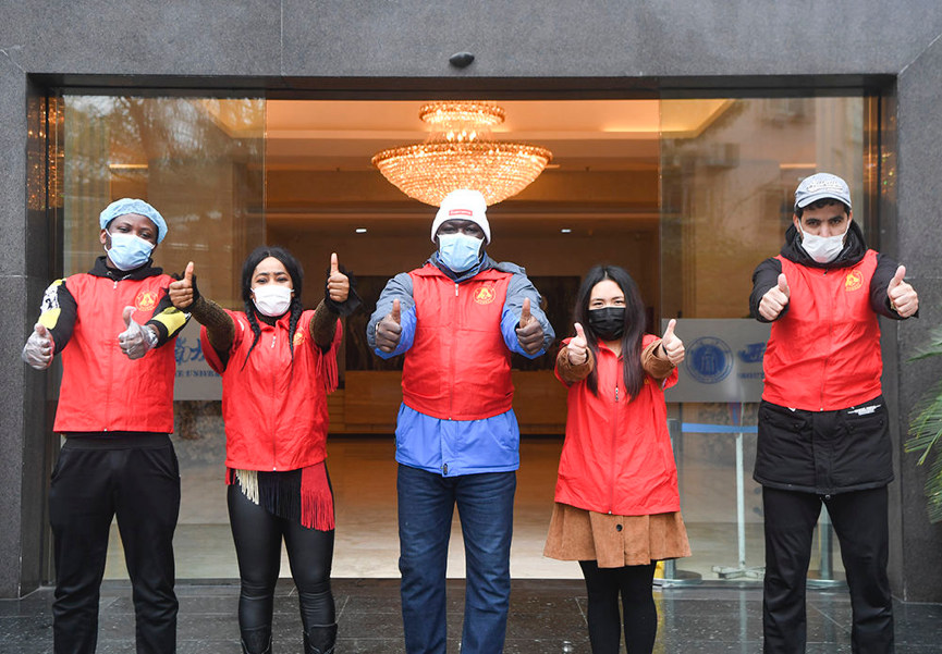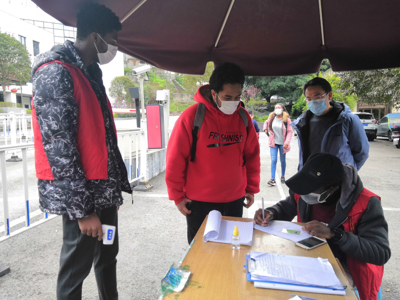 2月28日下午,学校二号门和五号门门岗迎来了五位特殊的执勤员,他们时而为进入校内的人员测量体温,时而查核登记出入人员的信息,身上的鲜红色志愿者马甲和异域外形尤为显眼,他们就是学校“洋雷锋”志愿服务队的成员。