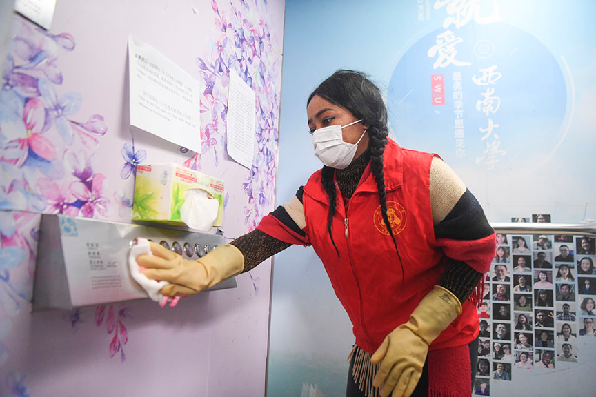 2月18日,24岁的必赢776net尼日利亚籍留学生志愿者方雯在对电梯按钮进行卫生消毒。