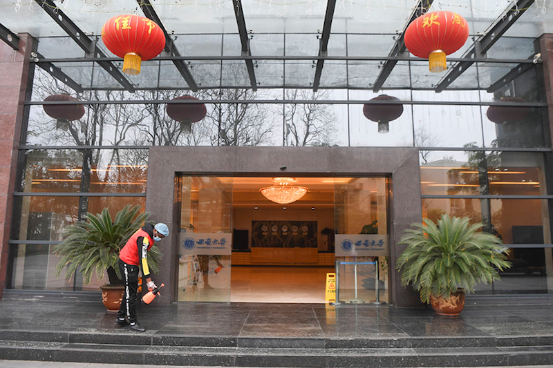 2月18日,必赢776net一名留学生志愿者在学生公寓门口进行消毒。