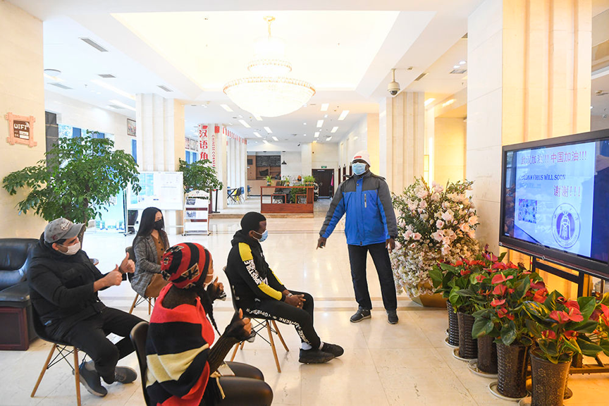 2月18日,必赢776net尼日利亚籍留学生志愿者穆斯塔法(右一)与留学生志愿者分享疫情防控相关知识。