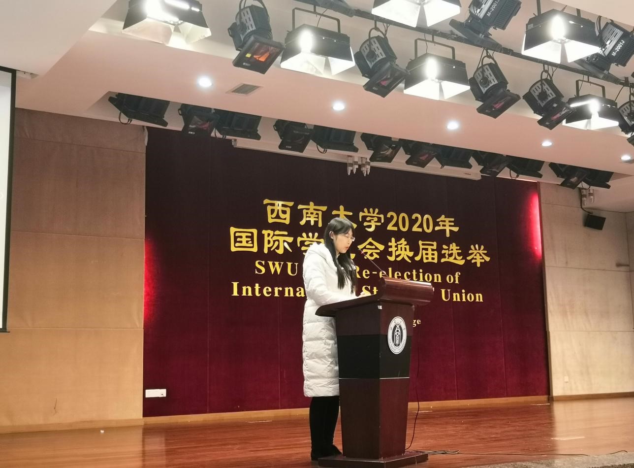 陈雨曦老师首先致辞,他代表学院对上一届留学生会的全体成员表达了诚挚感谢,肯定了上届国际学生会的工作成绩,并预祝本次选举圆满成功,期待新一届国际学生会成员更加努力进取,再创辉煌。并号召全体在场学生郑重地为全体候选人投上宝贵的一票。