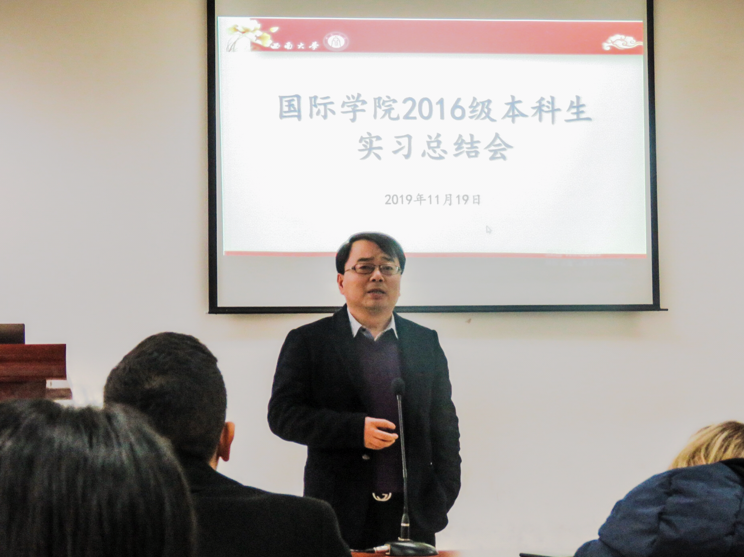 会上,张家政副院长首先祝贺2016级同学圆满完成实习任务归来。他指出,实习既是检验同学们过去三年汉语学习成果的舞台,也是让同学们学以致用的良机;相信大家通过实习,锻炼了自己、提升了自己,同时也发现了不足。实习总结会是大家分享实习经验、检视实习问题、提出实习困惑、解决实习问题的良好平台。希望同学们借此总结会,好好总结反思,从而更好更快地提升自己,同时希望大家在学习、生活中要不断有意识地培养、锻炼自己的总结、反思的能力,做善学、善思之人。最后,张家政副院长祝愿同学们今后能成长为优秀的中国语言和文化的传播者、中国与世界各国友谊的使者。