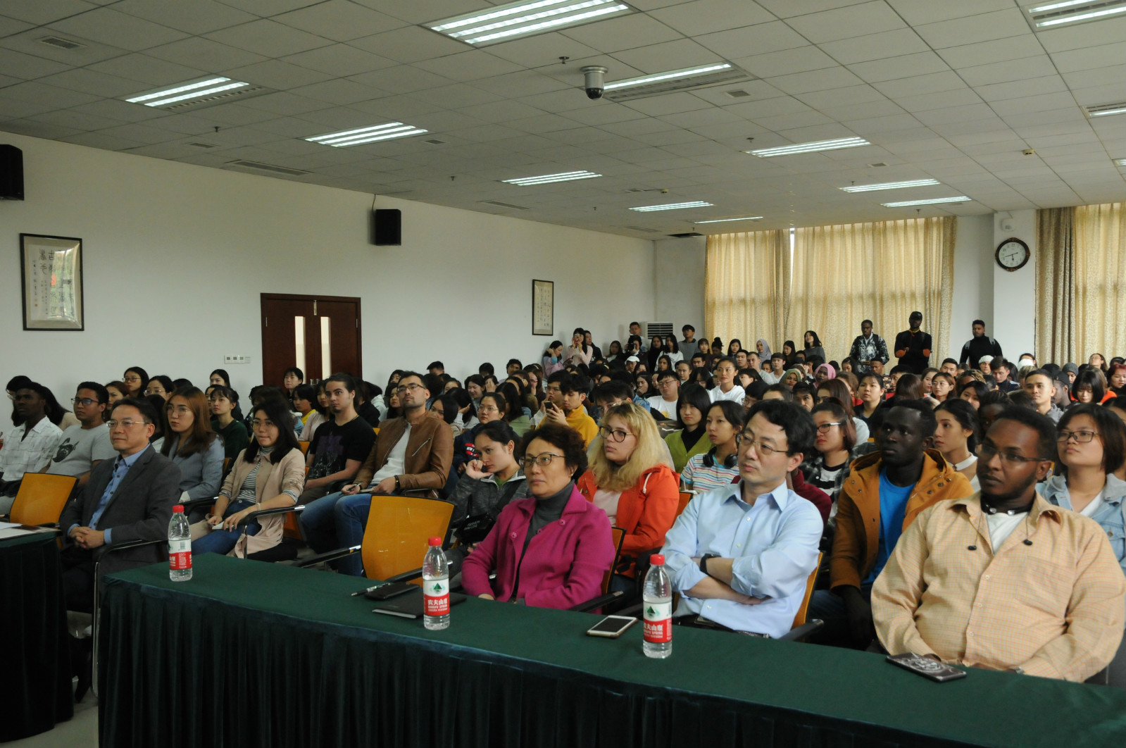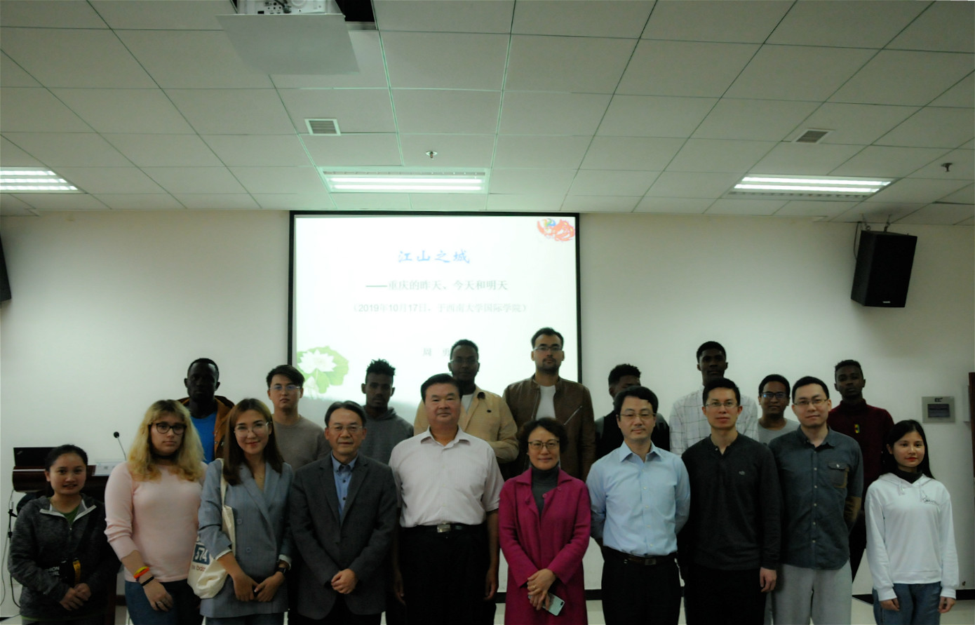 10月17日下午在必赢776net紫云楼317报告厅,学校国际学生中国国情教育宣讲活动正式启动,国务院特殊津获得者、全国有突出贡献的党史专家周勇教授应邀作了题为《江山之城——重庆的昨天、今天和明天》的讲座,180余名中外学生和宣讲团全体成员到场聆听,现场气氛热烈。讲座由刘猛书记主持。
