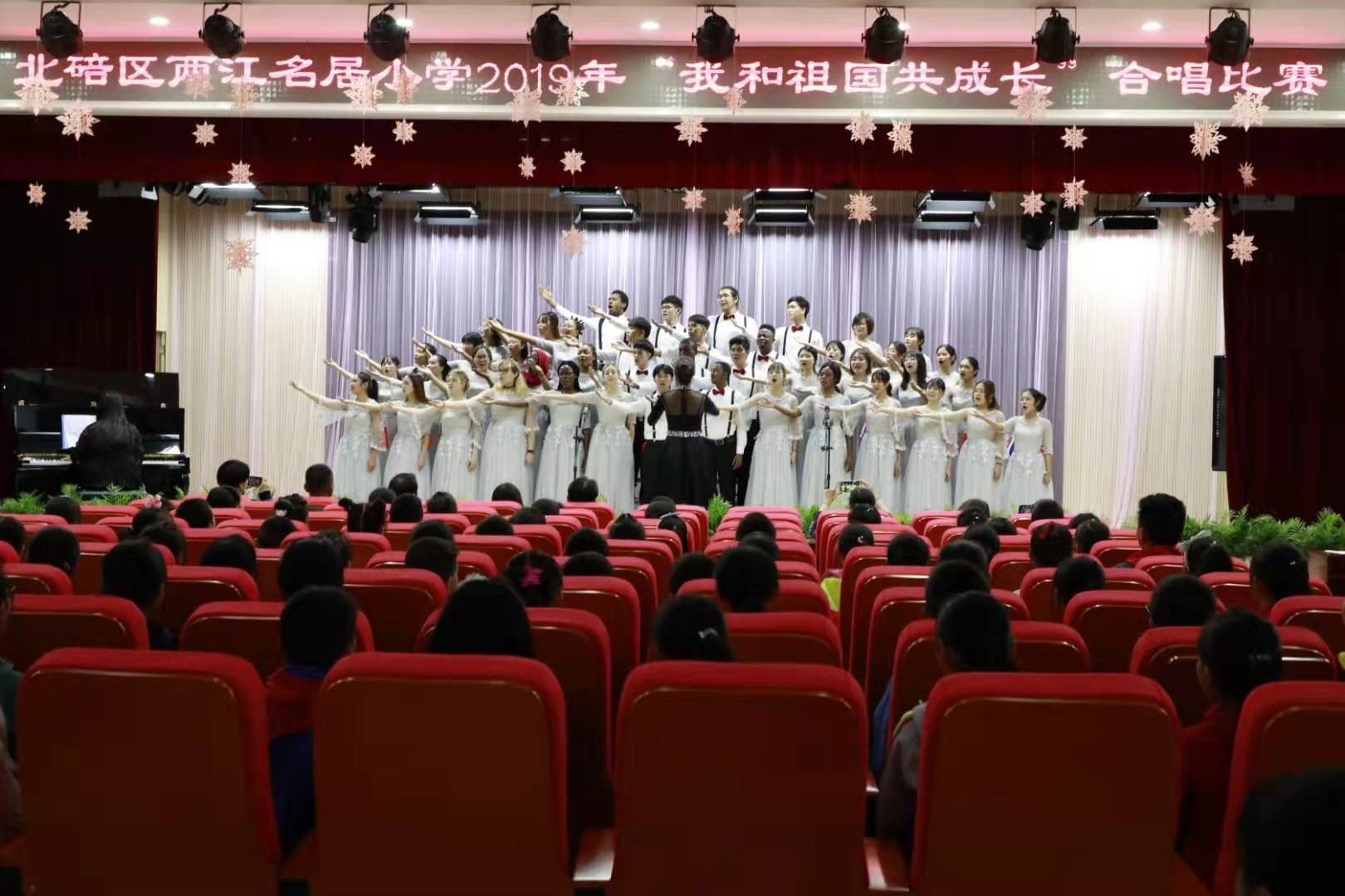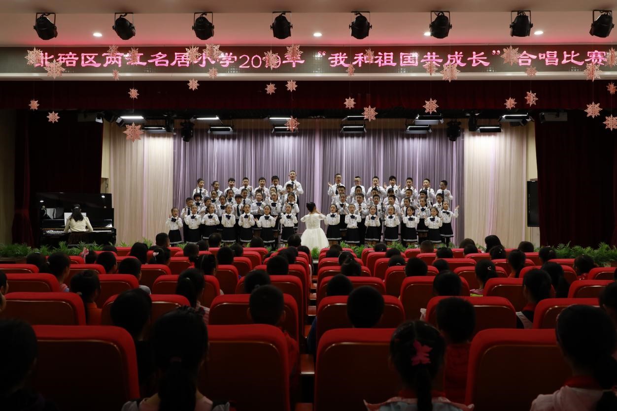 此次校园合唱比赛由北碚区两江名居小学主办,分为低、高两个年级组别。经过激烈角逐,每个班级的孩子们都使出了浑身解数,展现出了最佳状态。在舞台上孩子们用各种优美的舞姿展现优美的旋律,用动情的声音,完美的表现,唱出了儿童的纯真与美好。老师们也纷纷拿出了看家本领,伴奏、指挥无所不能,每个人的脸上都充满了微笑。必赢776net必赢776net五洲合唱团献上了《我和我的祖国》《友谊地久天长》,表达了对中国的热爱和对两江名居小学的深切友谊。