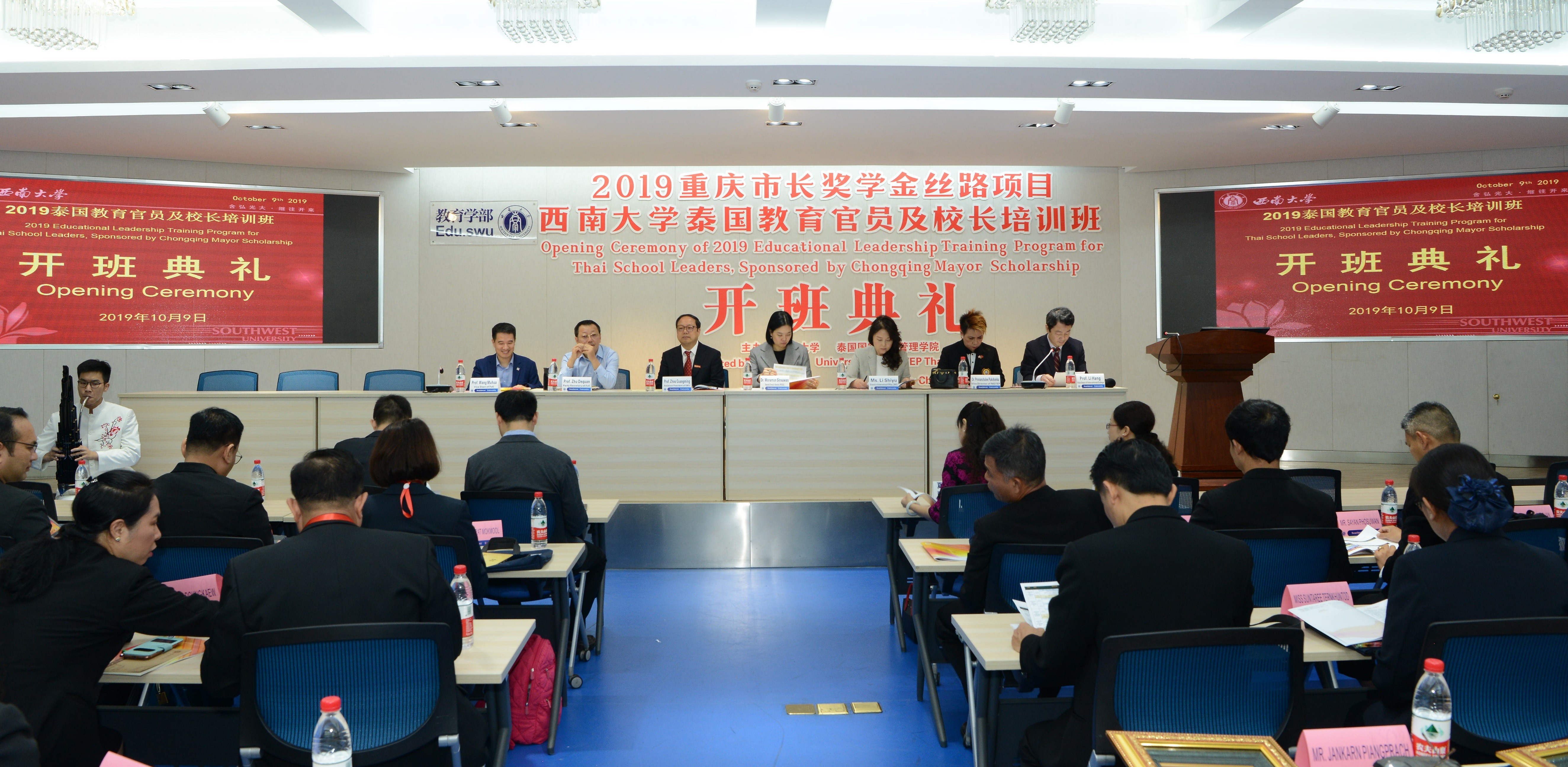 10月9日,2019年重庆市人民政府市长奖学金丝路项目——“泰国教育官员及校长培训”开班典礼在教育学部举行。泰国驻成都总领事馆副总领事万兰梦、泰国国家教育行政管理学院副院长帕安差丽、重庆市教委国际合作与交流处处长李世玉、学校校长助理周光明,教育学部相关负责人、专家以及30名泰国教育官员及校长出席开班典礼。