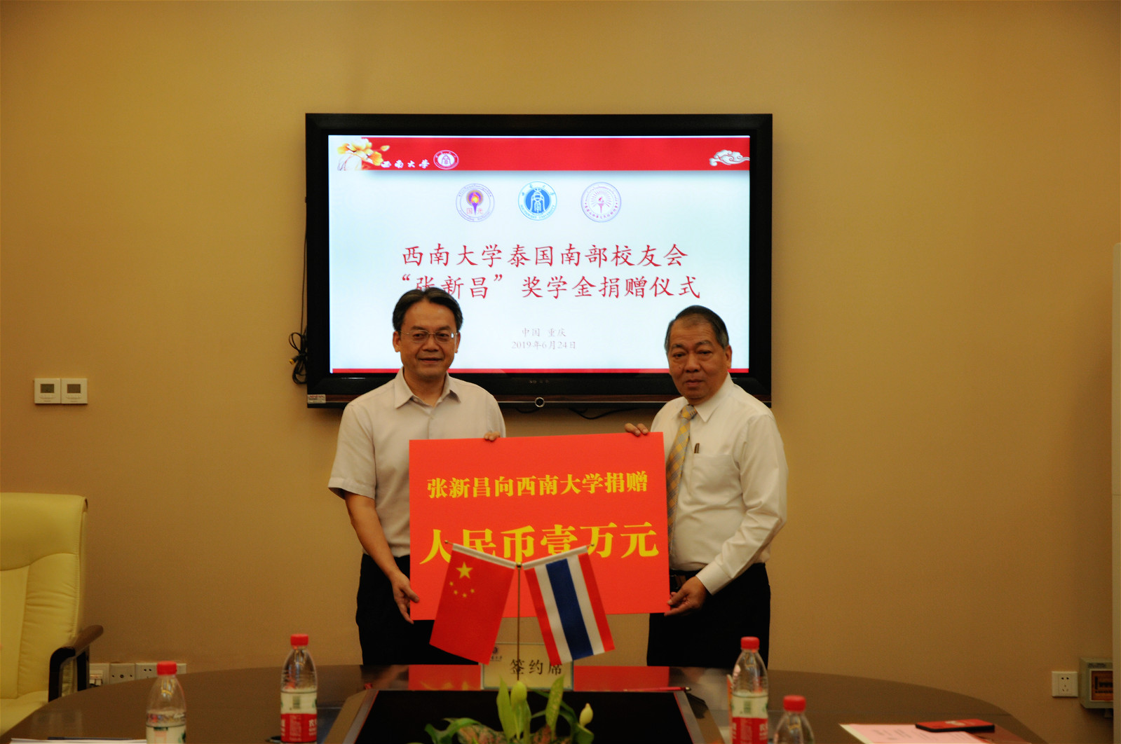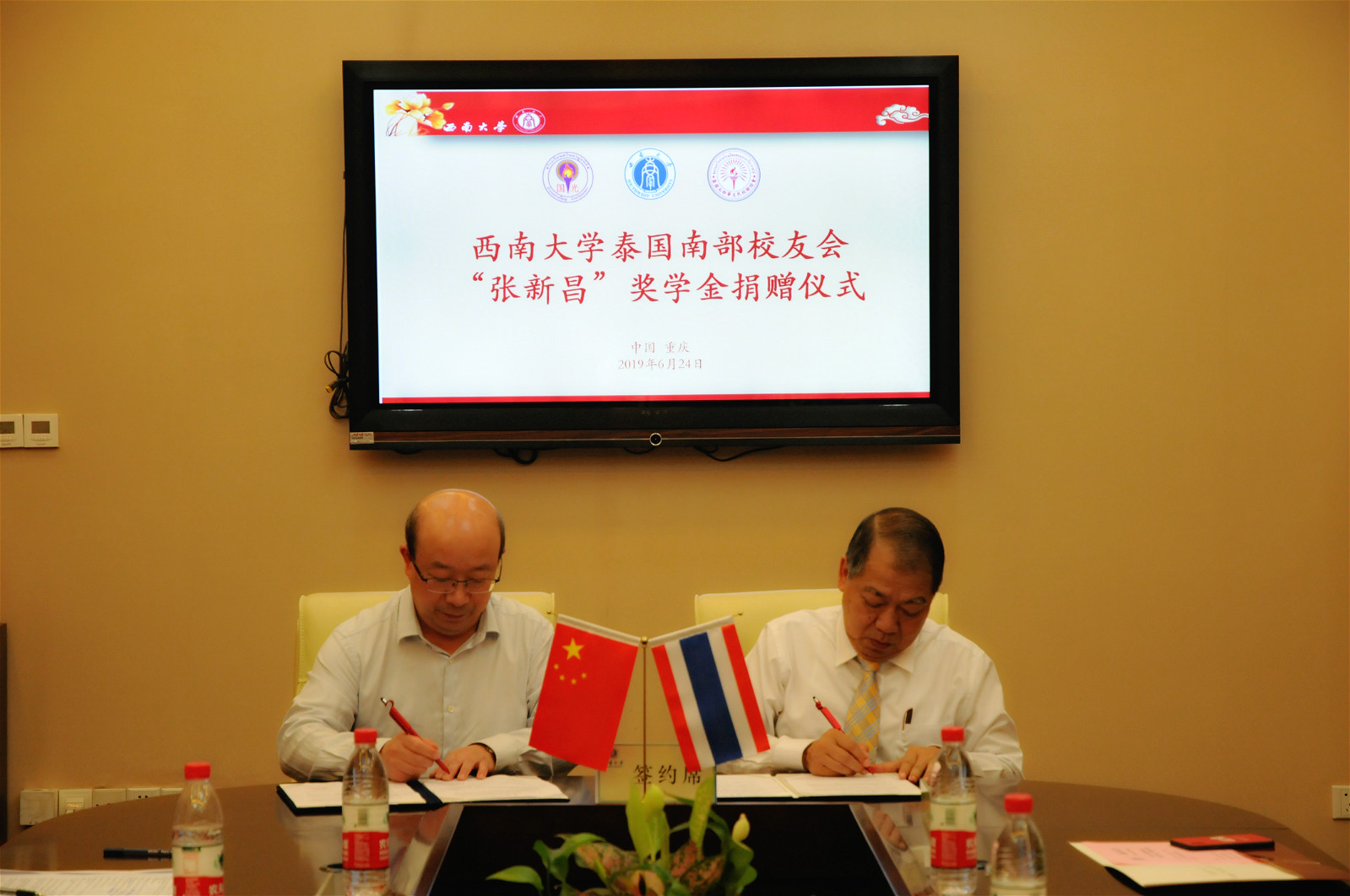 在一片热烈的掌声中,受赠双方代表龚常智秘书长和张新昌先生 共同签订了捐赠协议。为支持必赢776net来华留学教育事业的发展,感谢必赢776net对国际学生的精心培养,张新昌先生向学校捐赠1万元人民币,设立泰国校友会“张新昌奖学金”,用以奖励品学兼优的泰国南部学生。