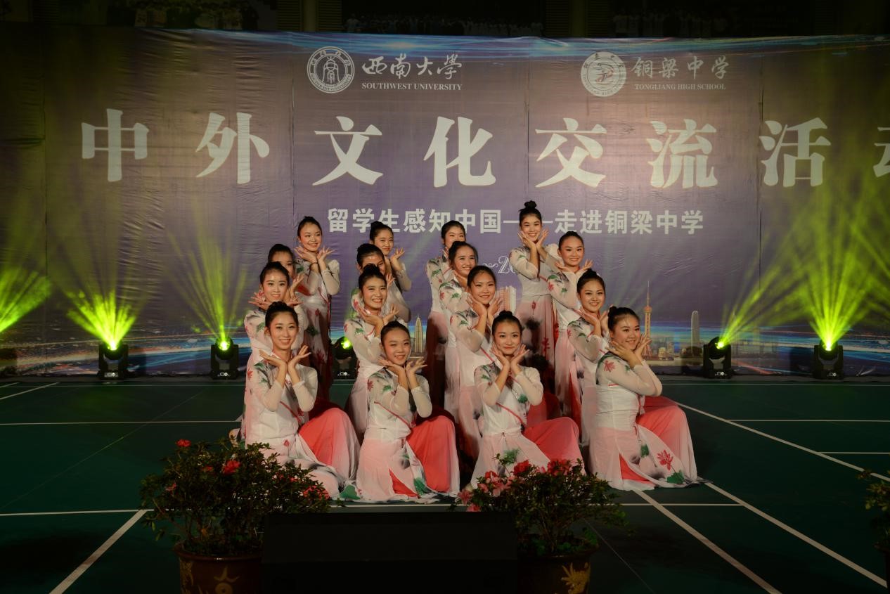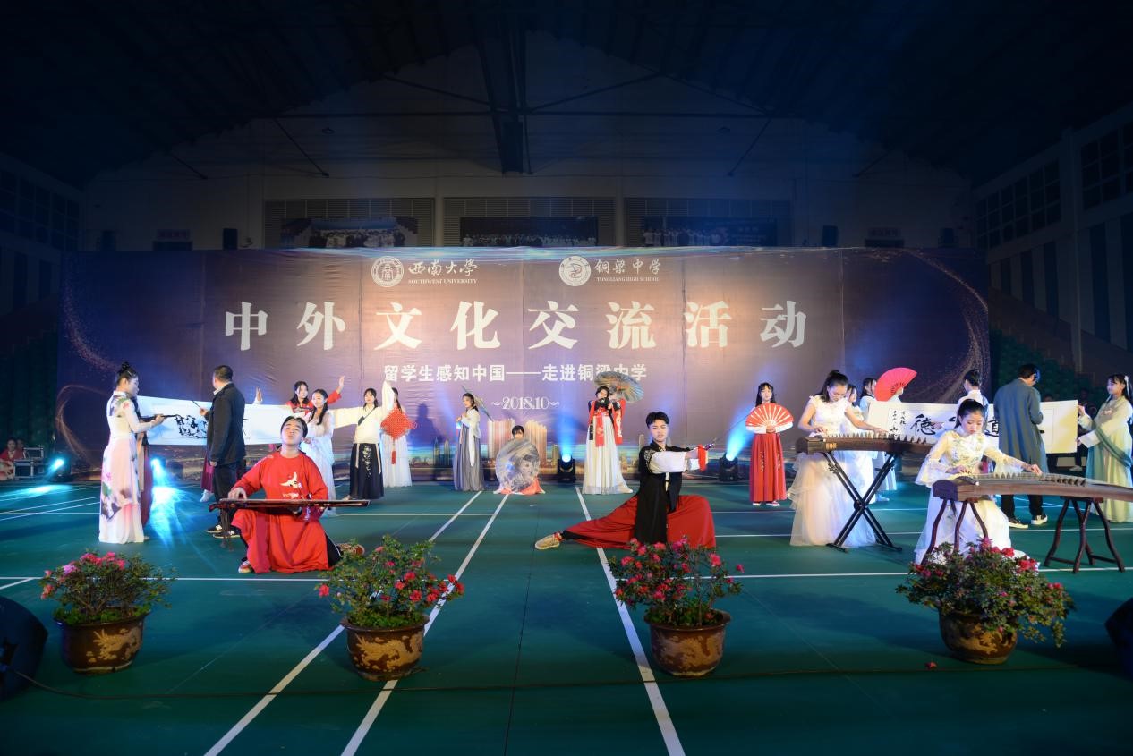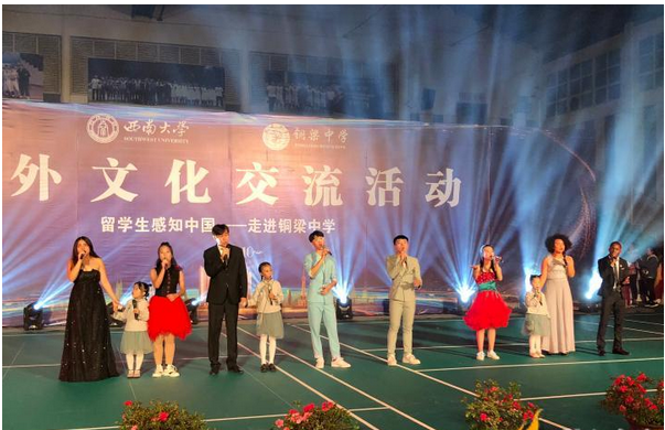 晚上七点,铜梁中学的全体学生和国际学生一起在铜梁中学体育馆参加了“留学生感知中国——走进铜梁中学”中外文化交流活动文艺晚会。