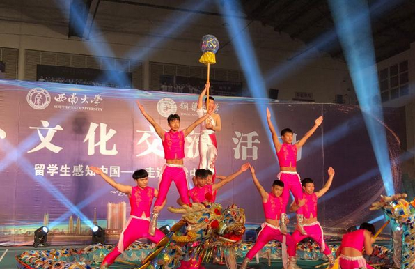 由铜中表演的节目《美丽中国》《明月几时有》等节目多姿多彩,富有民族特色,让国际学生们领略到中国传统文化的无穷魅力。而国际学生带去的非洲舞蹈和亚非美歌曲更是将晚会气氛推向高潮。最让国际学生叹为观止的就是铜梁中学《龙舞九天》的龙舞表演。只见他们表演时龙头、龙身、龙尾都随着玩舞的力度和快慢而发出耀眼的光芒。经典美观的龙头、浑圆壮实的龙身、力量感十足的龙尾,配上具有浓厚重庆元素的曲调,全方位展示了中国龙高大、迅猛、矫健的壮丽景象。现场掌声不断,尖叫不断,国际学生们不住的说:“真是大开眼界呀!中国文化博大精深,早就听说过铜梁龙舞,今天能在现场看到,真是太幸运了!”