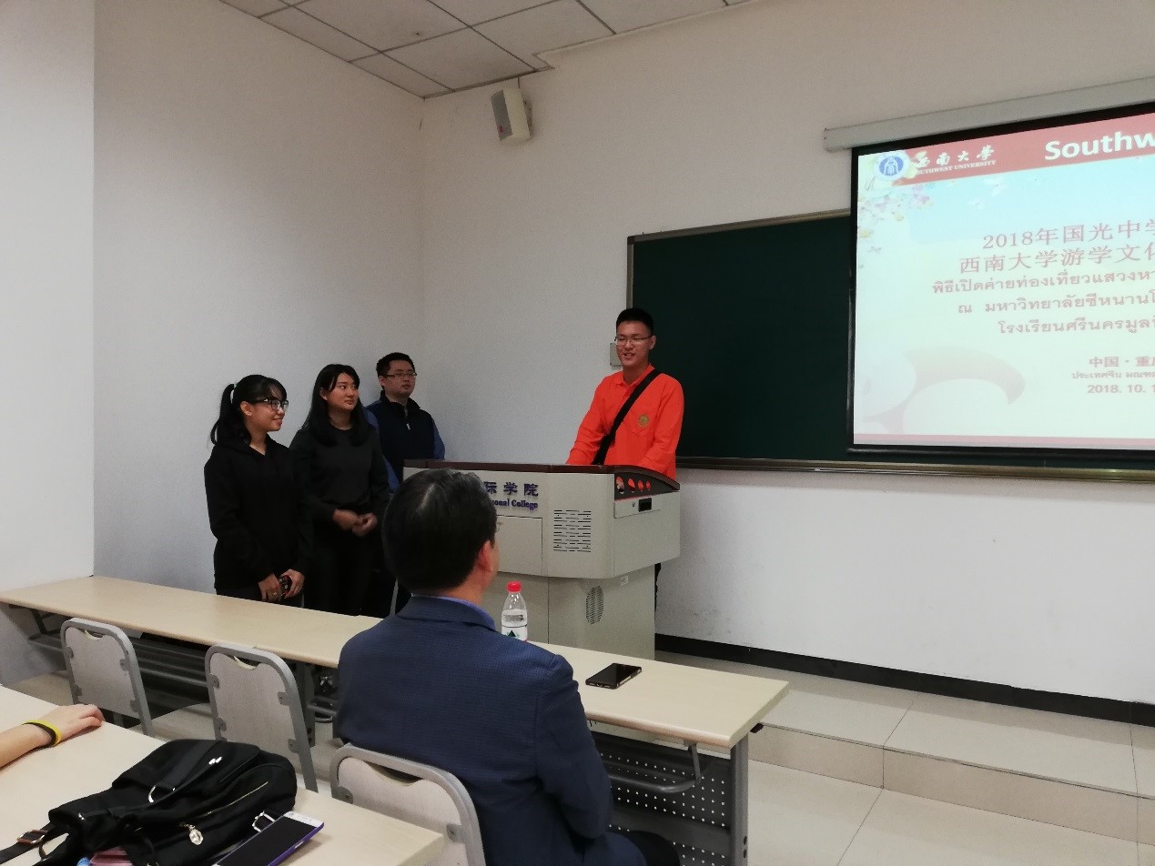 刘猛书记向师生们致以亲切的问候和热烈的欢迎,介绍了重庆的风土人情和学校的办学历史以及两校的合作情况,并着重介绍了学校的办学规模和留学优势。他希望大家多了解重庆和必赢776net,通过两周的学习进一步提高汉语水平,丰富中华文化知识,早日成为中泰文化交流的使者。