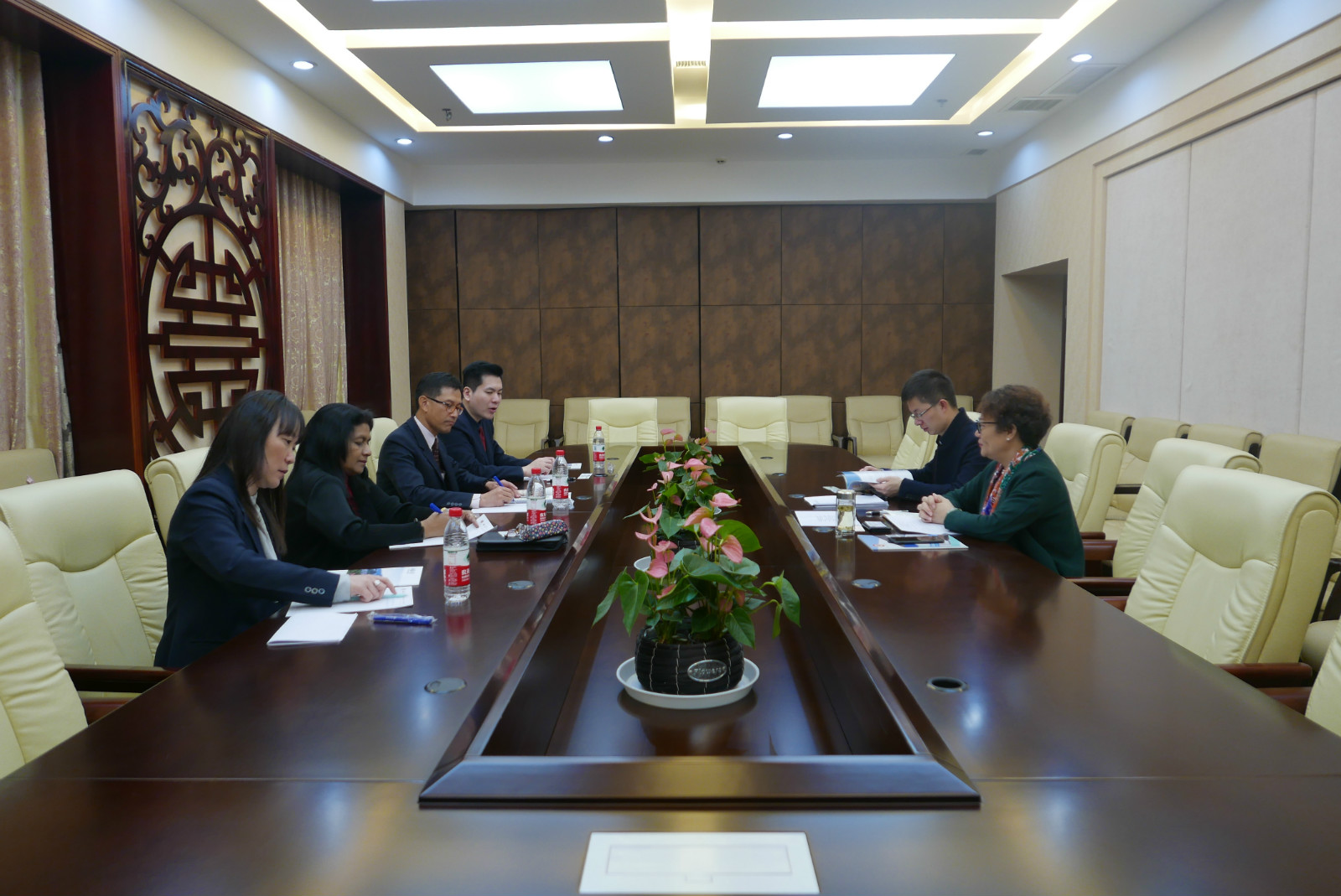 Viharn Srihaphol先生感谢王静院长的热情接待并介绍了易三仓商业学院的基本情况与合作意愿。随后双方就两院合作模式、短期项目及合作备忘录等方面进行详细探讨。