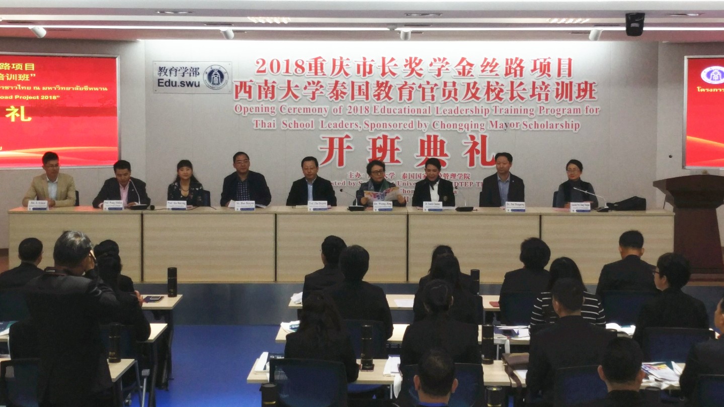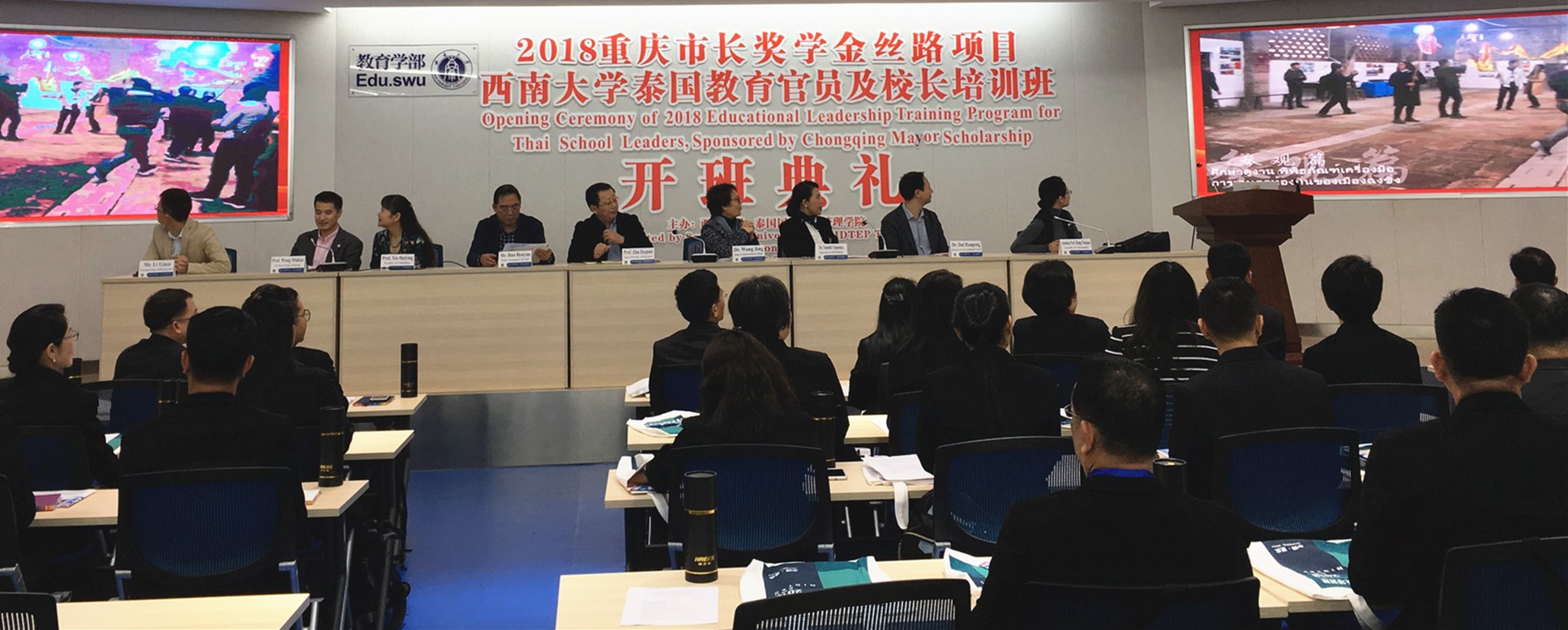 10月9日上午,2018重庆市长奖学金丝路项目“泰国教育官员及校长培训”开班典礼在教育学部举行。来自泰国的29名校长和3位教育官员以及相关负责人参加了本次开班典礼。典礼由教育学部王牧华副部长主持。必赢776net必赢776net院长王静博士、必赢776net教育学部党委韩友仁书记、必赢776net教育学部部长朱德全教授、泰国教育部秘书长代表教育行政管理学院国际部部长Temchit Chantaka博士出席典礼并讲话。