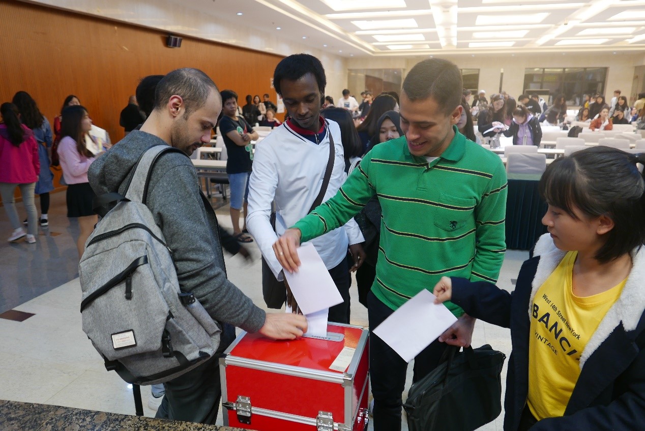 在主持人介绍了选举规则和投票方法之后,竞选演讲正式开始。来自17个国家的30位竞选人依次上台发表演说,分别就自己对学生会的认识,以及在过去工作中取得的优异成绩,对未来工作的展望等方面做出了激情的演讲,并博得了台下同学的热烈喝彩。所有演讲结束之后,在现场工作人员的组织下,国际学生代表依次投下自己神圣的一票。最后,竞选同学和大会工作人员合影留念,选举大会圆满结束。