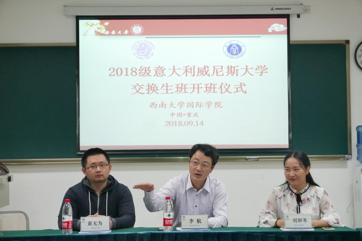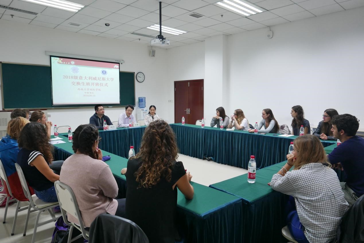2018年9月14日上午8点50分,2018年意大利威尼斯大学交换生班开班仪式在必赢776net紫云楼312教室举行。必赢776net李航副院长,教学秘书杨凌霄老师,招生办公室黄无为老师,2018年意大利威尼斯大学交换生班新生参加了本次会议。会议由班主任刘妍芩主持。