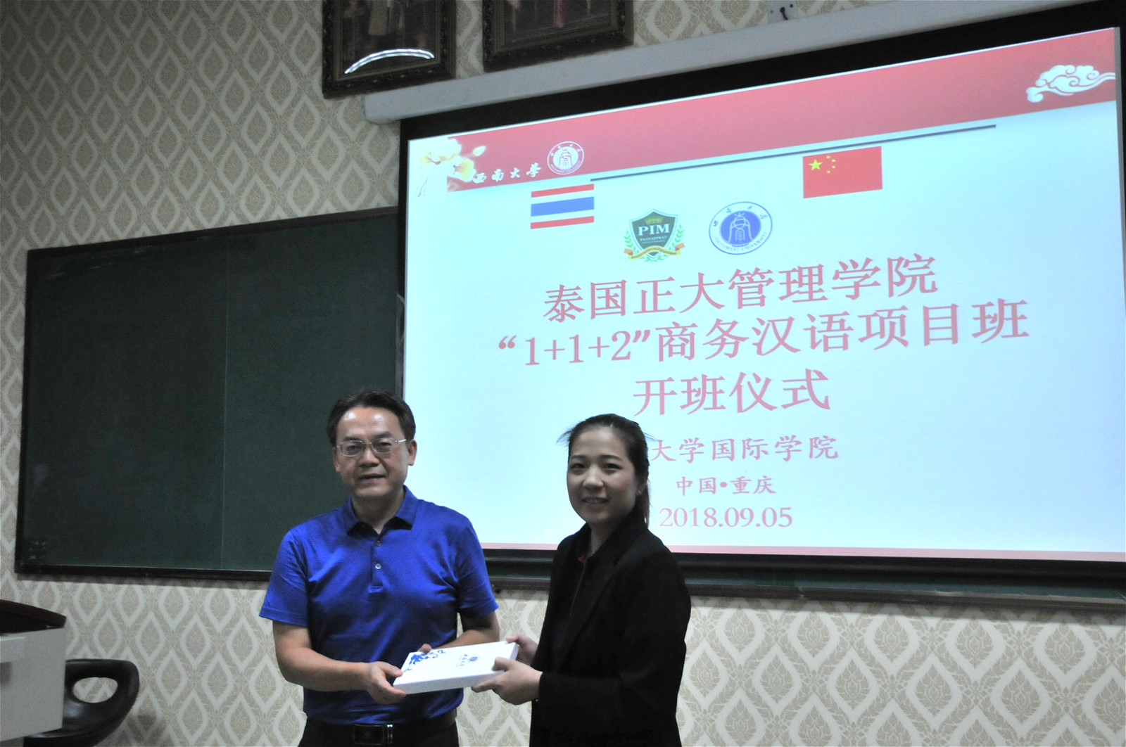 刘猛书记与泰国正大管理学院周小月老师互赠礼物,具有中泰特色的礼物传递着两校师生浓浓的情谊。我们期待双方能在更多领域加强合作、结出硕果,也希望泰国同学能在西大放飞梦想,学有所成。