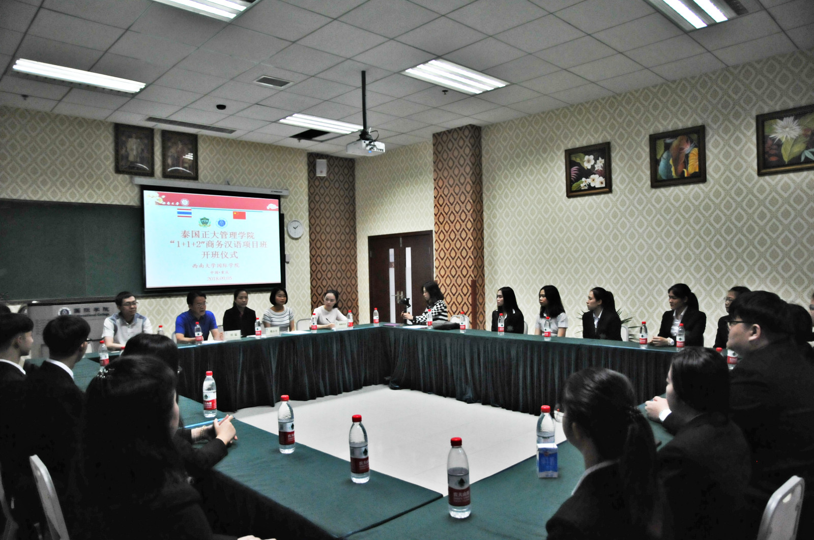 2018年9月4日上午10点,2018级泰国正大管理学院“1+1+2”商务汉语本科项目班开班仪式在必赢776net紫云楼泰国文化教室举行。学院党总支书记刘猛,泰国正大管理学院领队周小月,学院任课教师代表,2018级泰国正大班新生以及来自学院2018级汉语国际教育硕士的中国语伴代表参加会议。