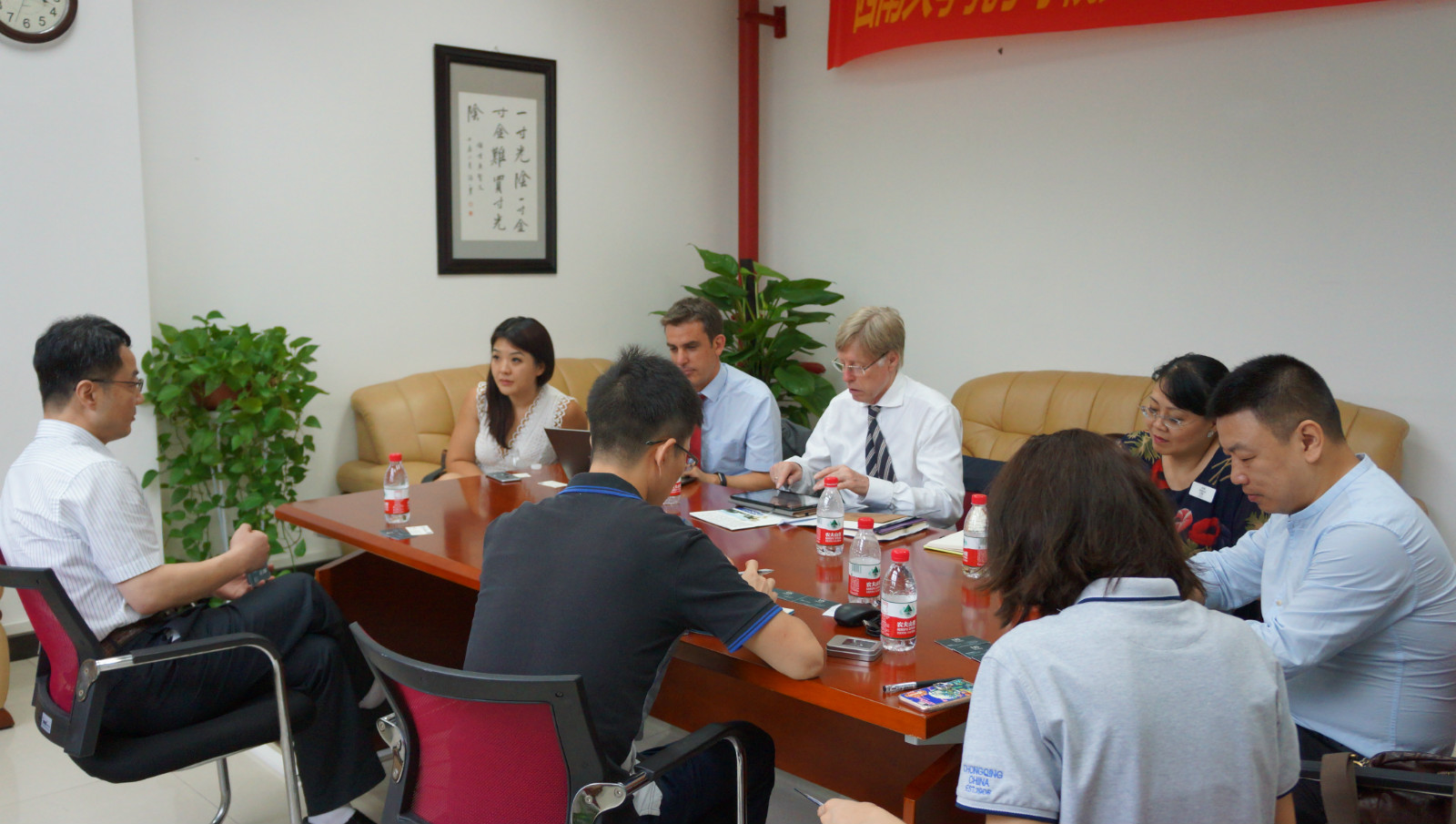 在李林泽的带领下,代表团一行参观了紫云楼教学、会议、办公、住宿等设施设备。在随后的会谈中,双方就选派英国学生来我校参加国际学生夏令营、为英国学生定制来我校短期学习项目等进行了详细商谈。会谈结束后,双方互赠礼物并合影留念。