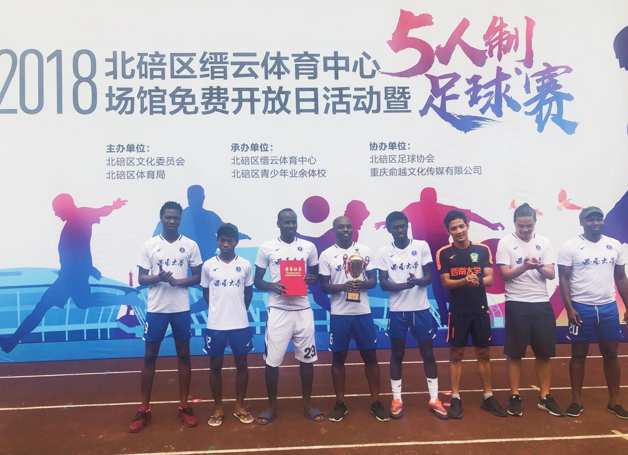 6月29日下午四点,2018年北碚区缙云体育中心场馆免费开放日活动暨五人制足球比赛在缙云体育中心拉开序幕。学校国际学生足球队等40支代表队参与角逐,学院刘猛书记出席比赛开幕式及闭幕颁奖仪式。在为期三天的比赛中,数百名足球爱好者齐聚绿茵场,为荣誉而战,挥洒青春,激情对抗,为大家呈现了一场场紧张刺激的对决,最终学校国际学生足球队技压群雄,荣获本次比赛的冠军。