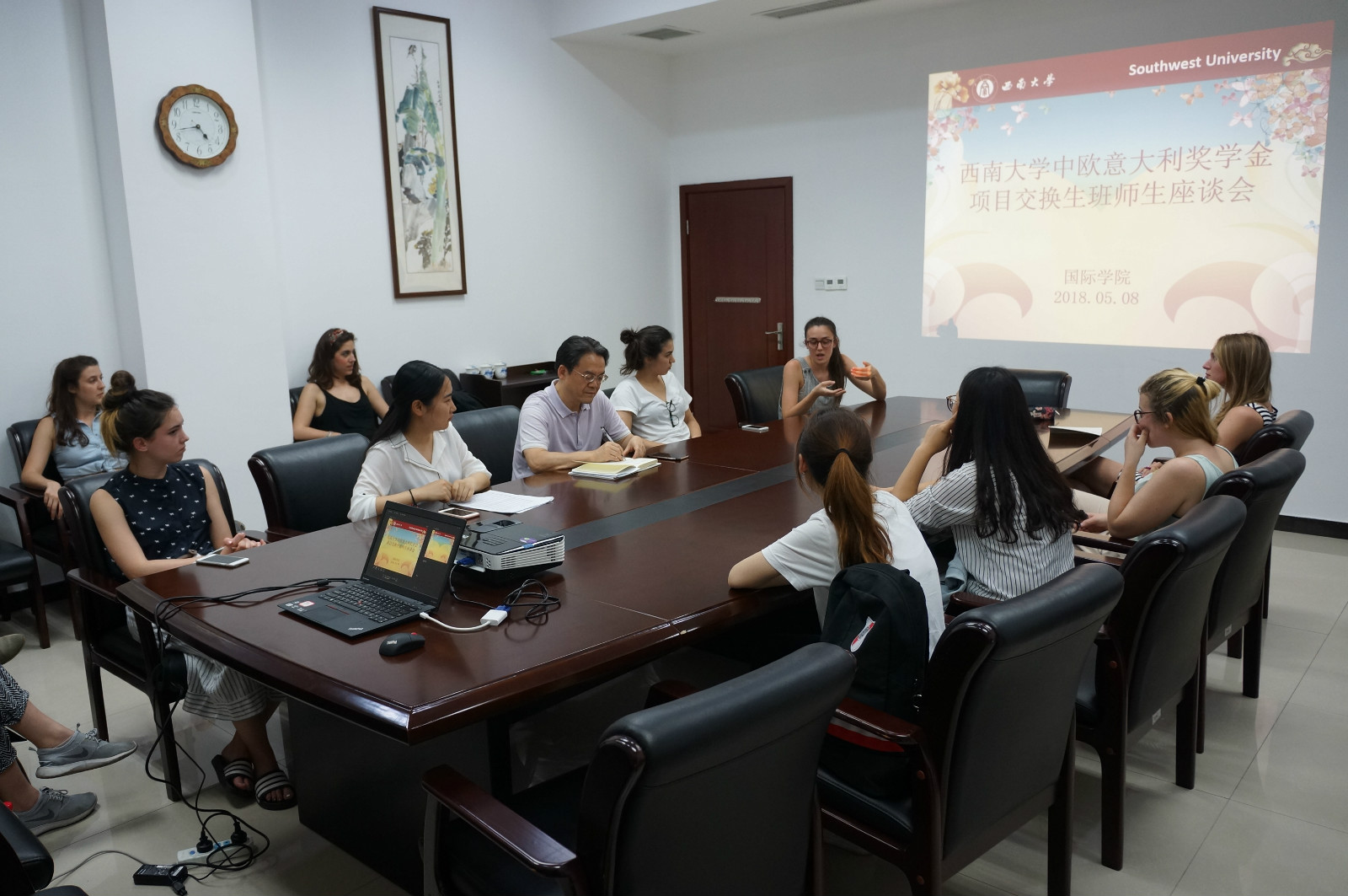 2018年5月8日下午4:45,中欧奖学金项目意大利班师生座谈会在紫云楼304会议室举行。学院党总支书记刘猛,中欧奖学金项目意大利班全体师生参加会议,会议由班主任刘妍芩主持。