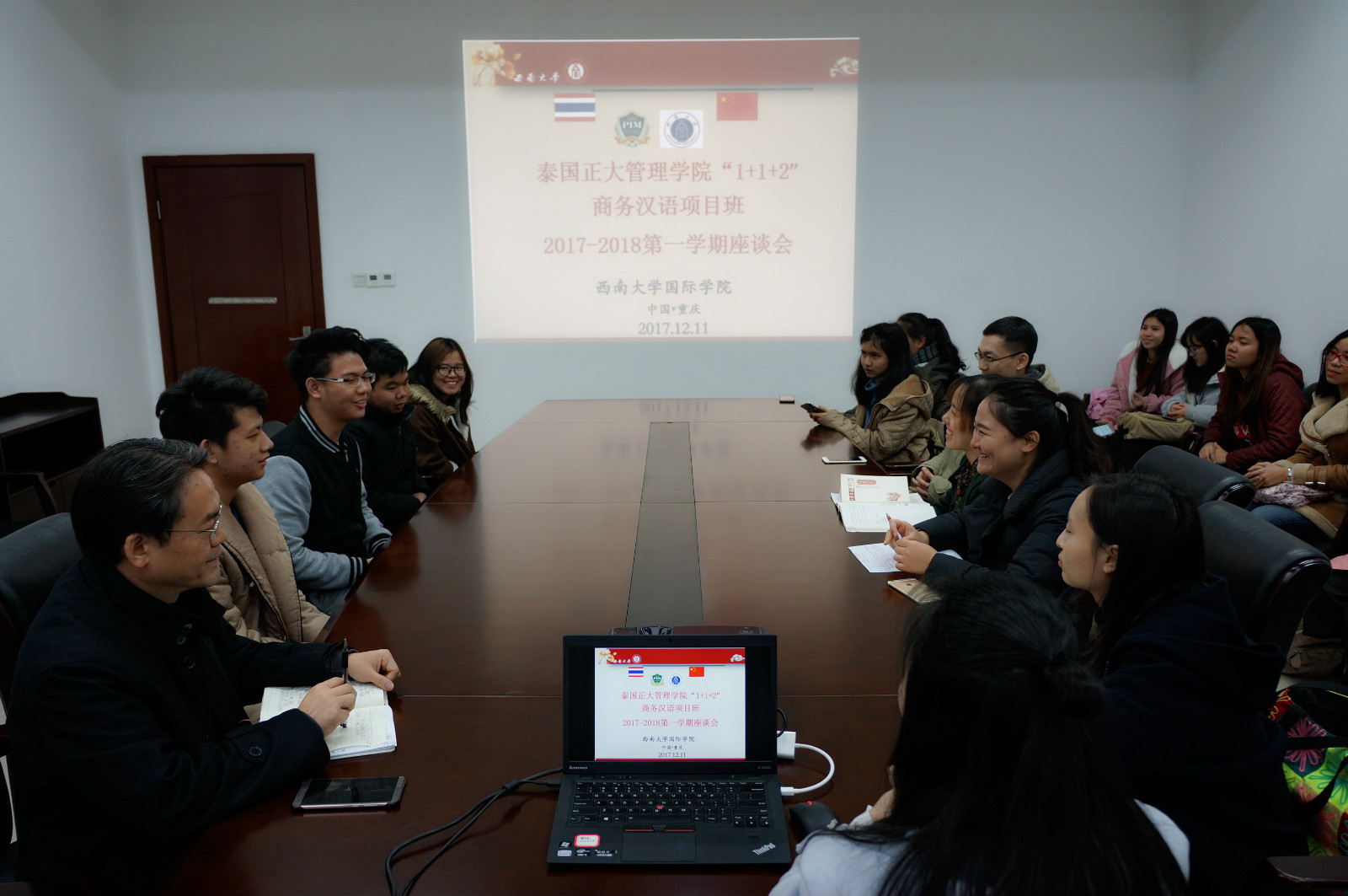 12月11日下午四点半,2017级泰国正大管理学院学生学期座谈会在必赢776net304会议室圆满举行。必赢776net党总支书记刘猛,正大管理学院项目班的5名任课教师以及14名泰国学生参加会议,座谈会由吴宗燕主持。
