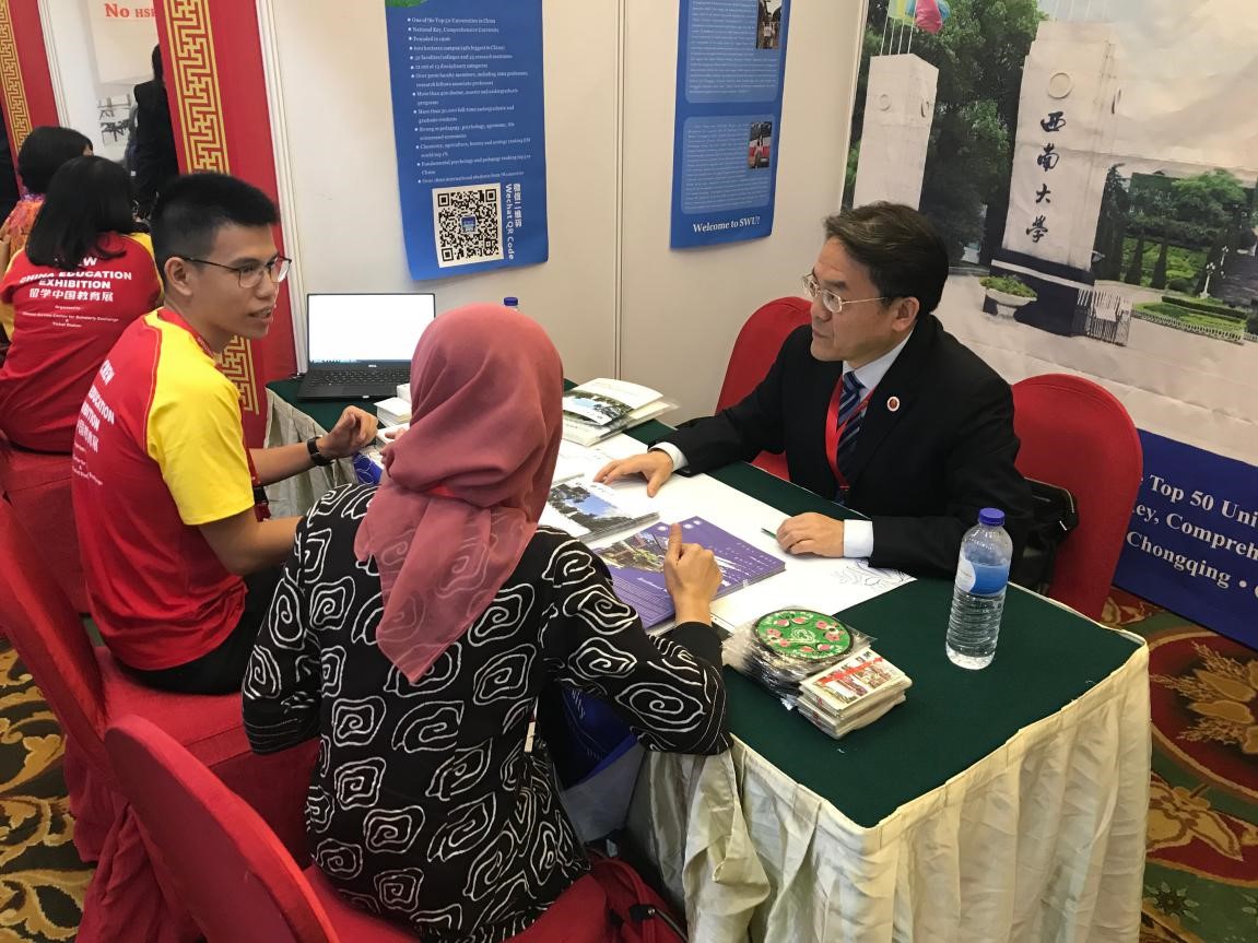 11月26日由中国教育部留学服务中心主办的印尼第十四届“留学中国”教育展在首都雅加达举行。刘延东为展览鸣锣开幕。中国国家教育部部长陈宝生、副部长田学军,科技部党组书记王志刚,印尼人类发展与文化统筹部秘书长萨特亚、副部长阿古斯,印尼研究技术与高等教育部部长特别顾问鲍丽娜等出席开展仪式并参观展览。我校展位以西大蓝为主打色,配以简明的学校介绍和印尼在校生的诚挚感言,在教育展中显得别具一格,吸引了众多高校学生及学生家长前来咨询入学申请事宜。刘猛在向学生及家长热情介绍学校的同时,也积极和中国及印尼的高校负责人沟通,并与部分印尼高校洽谈初步合作意向。