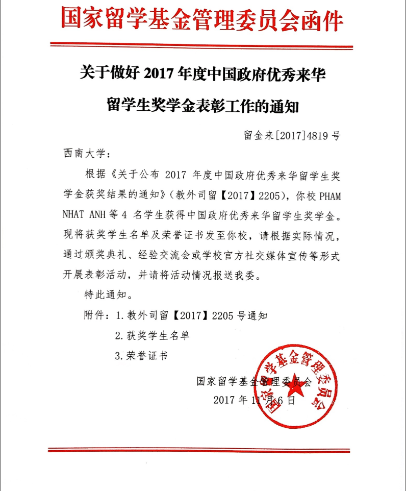 为扩大中国政府奖学金的辐射面和影响力,培养更多知华、友华的国际优秀人才,教育部针对在华国际学生设立了“优秀来华留学生奖学金”。近日,学校坦桑尼亚学生MKONDA MASAFIRI YUSUPH、越南学生PHAM NHAT ANH、泰国学生THAWILRAK EAKDAMRONG、哈萨克斯坦学生ZUPIR SAKEN四名同学凭借优秀的学业学术成绩分别获得研究生类别和本科生类别的“优秀来华留学生奖学金”。