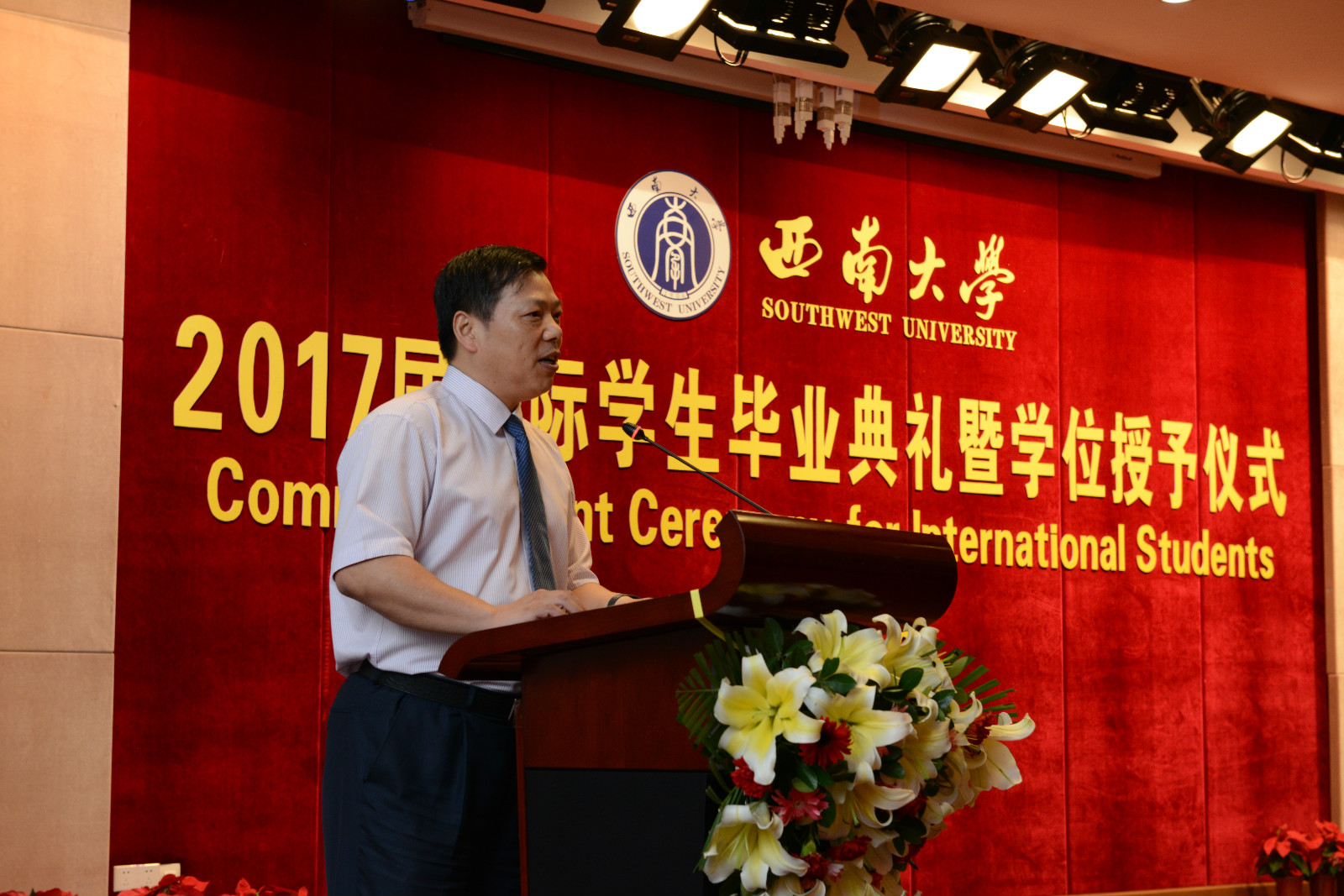 校长张卫国寄语全体毕业生,从生活中的点滴变化谈起,以移动支付与高铁为例,展示了一个持续发展,具有无穷创新能力的中国,鼓励同学们发挥才干,积极参与“一带一路”建设;从重庆刚刚度过的20周岁直辖生日谈起,展示了一个越来越有国际范儿的重庆,高速发展的重庆魅力让留学生爱上重庆、爱上中国;从学校留学生教育事业的发展谈起,展示了学校为培养留学生而举办的各项活动,希望各位留学生学有所获。
