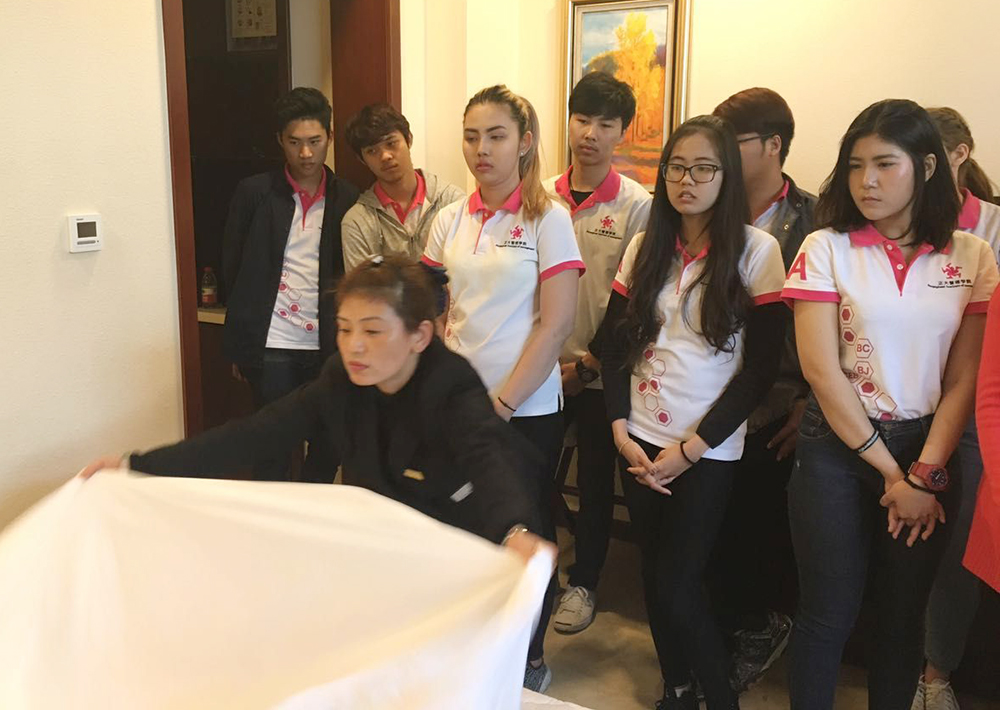 这批学生在我校必赢776net交流学习期间,根据专业实践的需要,联系后勤集团接待中心进行短期实习和培训。后勤集团及接待中心高度重视,召开专题研讨会确定将20名留学生分为两组分别在客房部和餐饮部轮流换岗实习,并为每两位同学指派一名实习指导主管,负责具体指导学生开展实习工作。