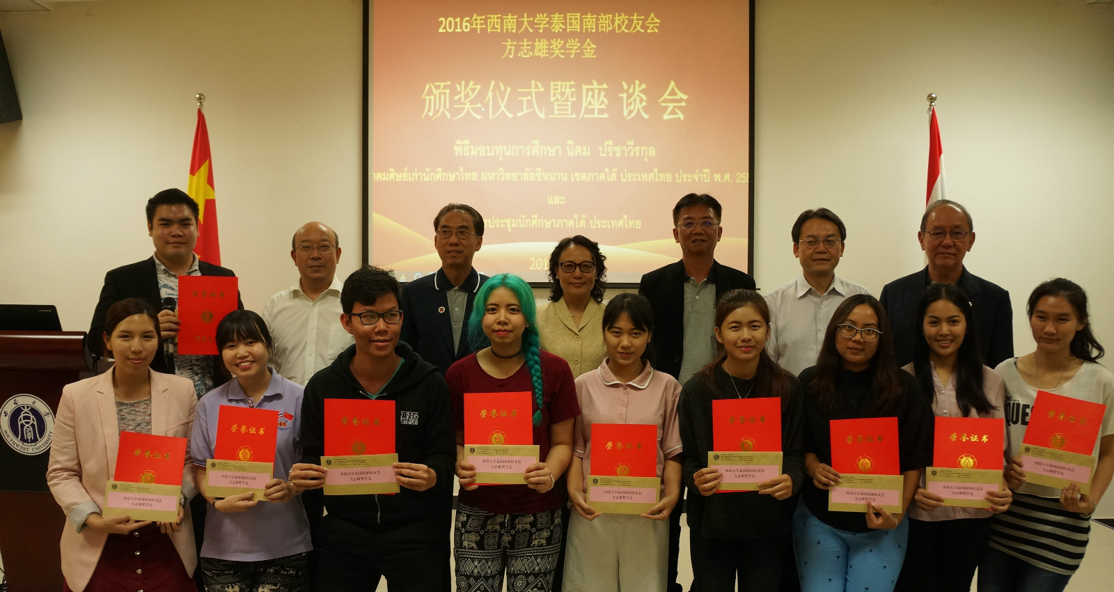 刘猛书记宣读了《必赢776net关于授予2016年泰国南部校友会“方志雄奖学金”的决定》,希望获奖学生珍惜荣誉,再接再厉,为中泰友谊贡献力量。与会嘉宾一起为首期11名奖学金获得者颁奖。