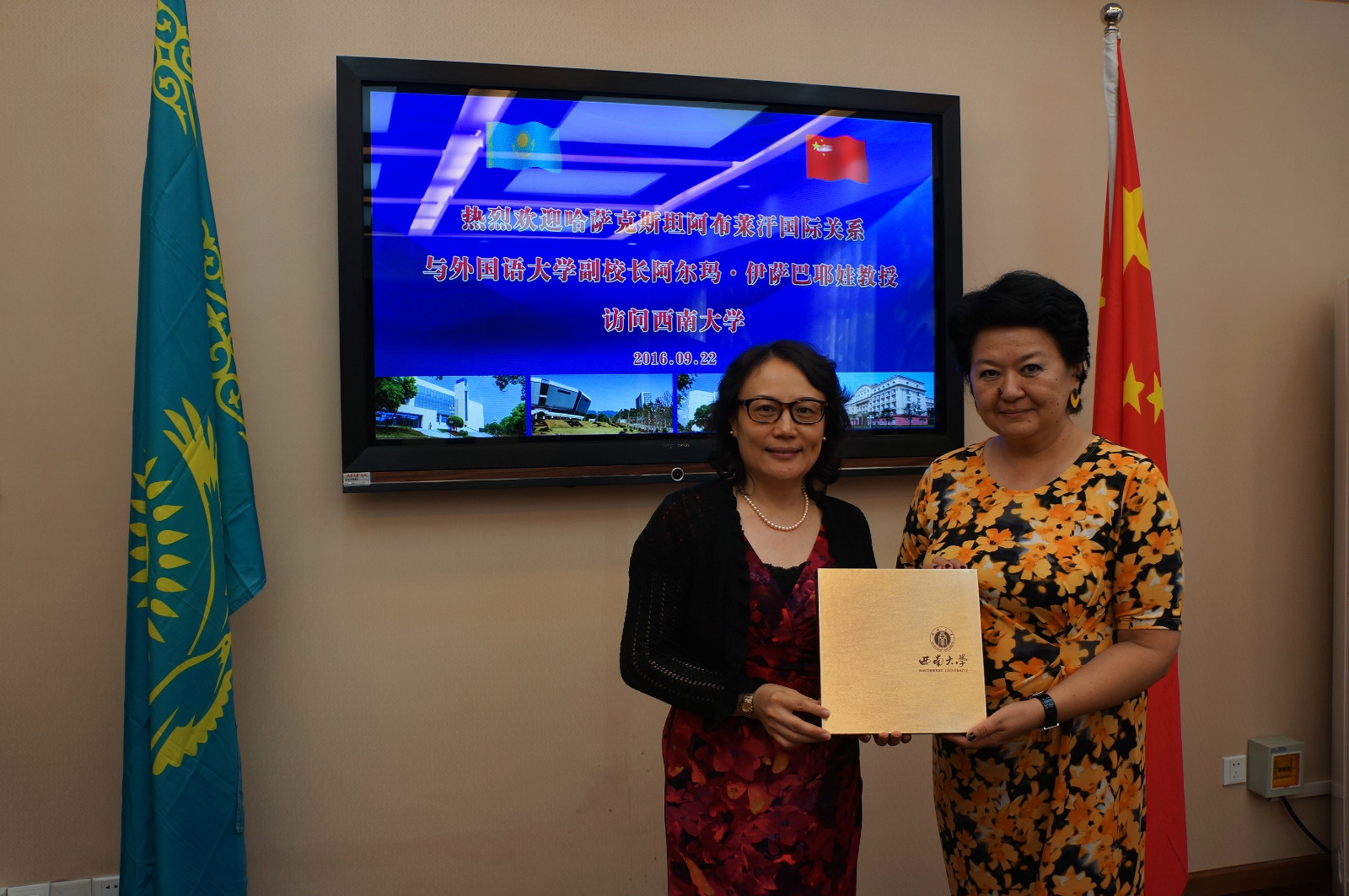 9月22日,哈萨克斯坦阿布莱汗国际关系与外国语大学(以下简称阿布莱汗大学)副校长阿尔玛伊莎巴耶娃教授和汉语中心主任托力肯教授访问我院。王静院长、李航副院长热烈欢迎客人的光临并举行座谈。