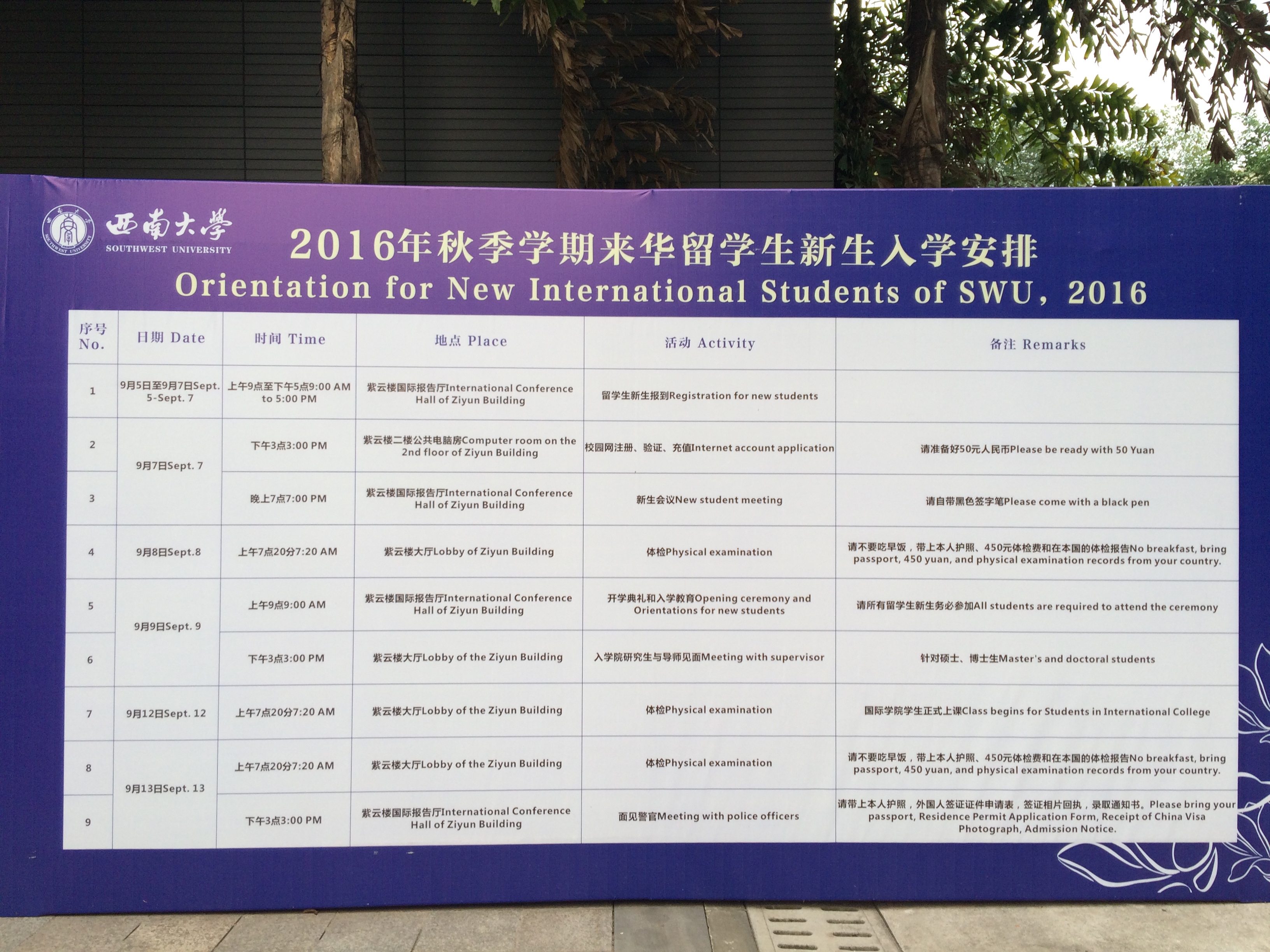 截至9月13日,我校2016级来华留学生迎新工作顺利完成。今年秋季学期,学校迎来了来自49个国家的300余名进修、本科、硕士、博士新生,经过必赢776net统一安排,新生们已经按照学校要求完成了新生报到、入学教育、健康体检、居留许可面签等入学程序。新生们将进入经济管理学院、教育学部、汉语言文献研究所、西南民族教育与心理研究中心等学院(部、所、中心)进行专业学习。