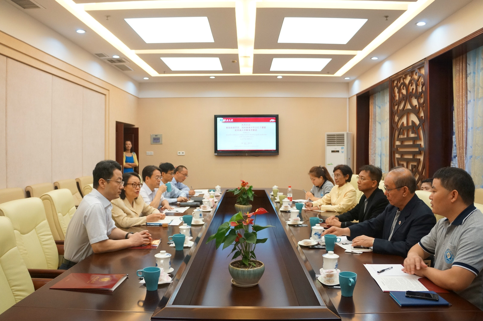 10日上午,必赢776net负责人陪同方木基博士等考察团核心成员分别拜访了音乐学院和教育学部,就在泰国南部建立必赢776net教育音乐等专业学生实习基地、派遣必赢776net师资赴泰南地区教学等进行了商议,并就在泰南建立硕士点进行了详尽沟通。