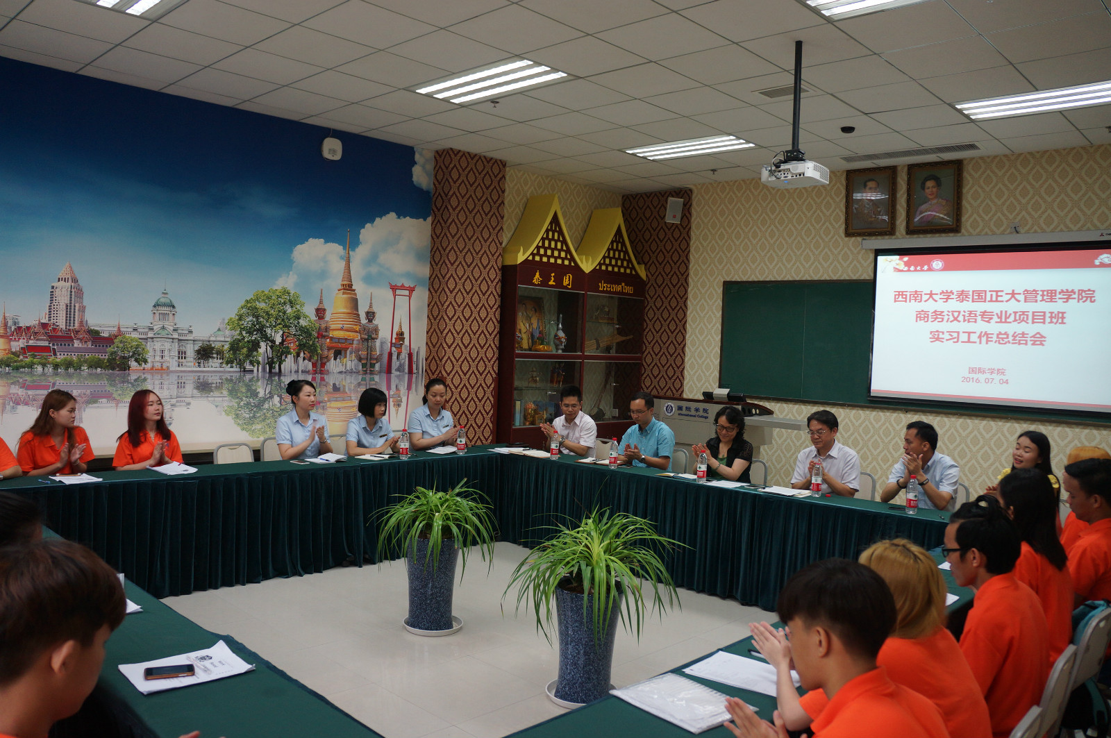 2016年7月4日上午9:30,泰国正大管理学院商务汉语项目班实习工作总结会在必赢776net泰国文化教室举行,必赢776net院长王静、党总支书记刘猛,后勤集团副总经理何昌昊,以及图书馆的相关负责人参加会议。