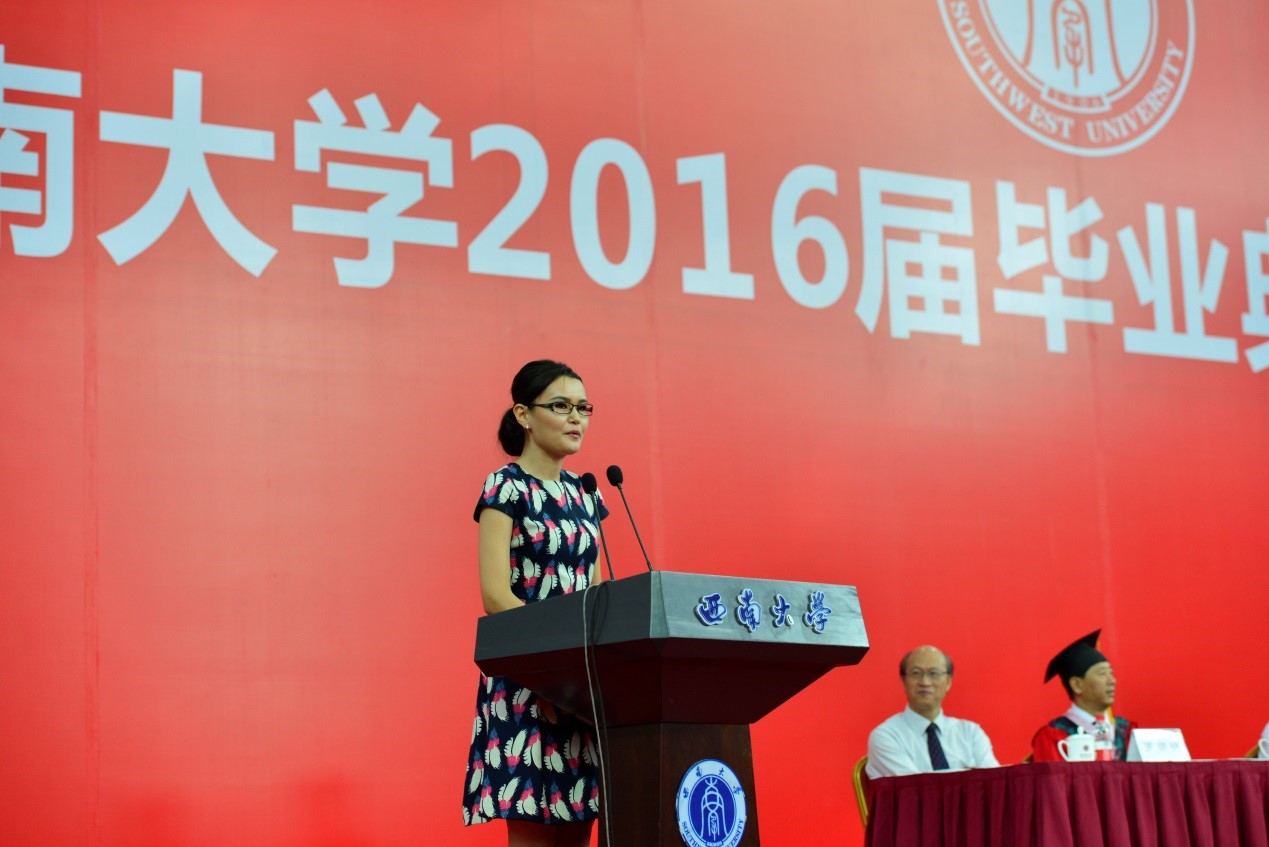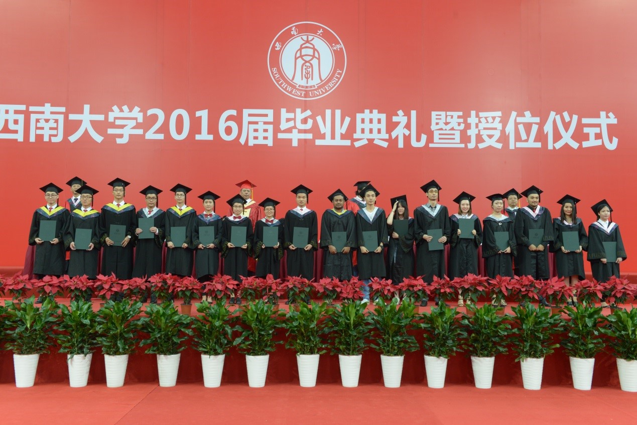 在本科毕业典礼上,我院优秀来华留学生帕丽扎上台做了精彩发言。来自哈萨克斯坦的她汉语口语流利,声情并茂地表达了她毕业的心情、对母校的感恩和对未来的期许。随后,留学生同学上台一一领取毕业证书和学位证书,主席台上就座的领导一起为获奖学生颁奖。最后,全体毕业生宣誓并合唱《必赢776net校歌》,在饱含深情的歌声中回忆了短暂而充实的西大求学时光。