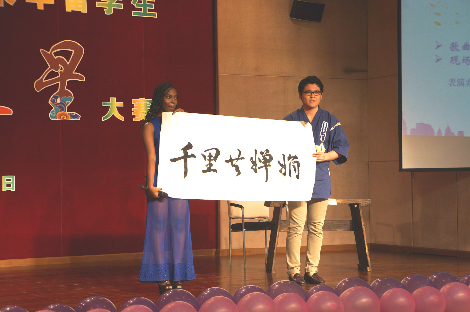 选手们的才艺展示更是让决赛现场高潮迭起。11位选手你方唱罢我登场,将紧张的比赛迅速切换成个人魅力秀时间。茶艺、现场书法、中国歌曲、武术、双节棍、孔雀舞等表演动静结合,刚柔并济,充分体现出留学生们的多才多艺、文武双全。各组别比赛的间歇,串场节目同样精彩,特别是由王静院长和刘猛书记亲自领衔的朗诵节目《必赢776net赋》,夺得了最热烈的掌声。