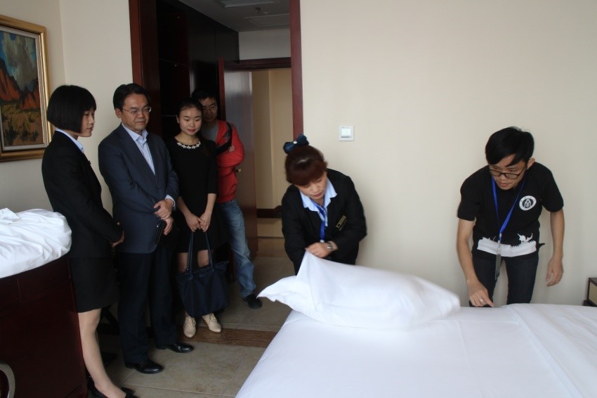 学院对泰国正大班的实习课程非常重视。经多方努力,上学期将同学们安排在学校中心图书馆实习,下学期则安排到桂园宾馆实习,此次实习为期一个半月。为使同学们在有限的时间内接触到宾馆的一线岗位,宾馆方面安排16名泰国同学在客房部和餐饮部轮流换岗实习,并为每两位同学指派一名实习指导主管,负责具体指导学生开展实习工作。