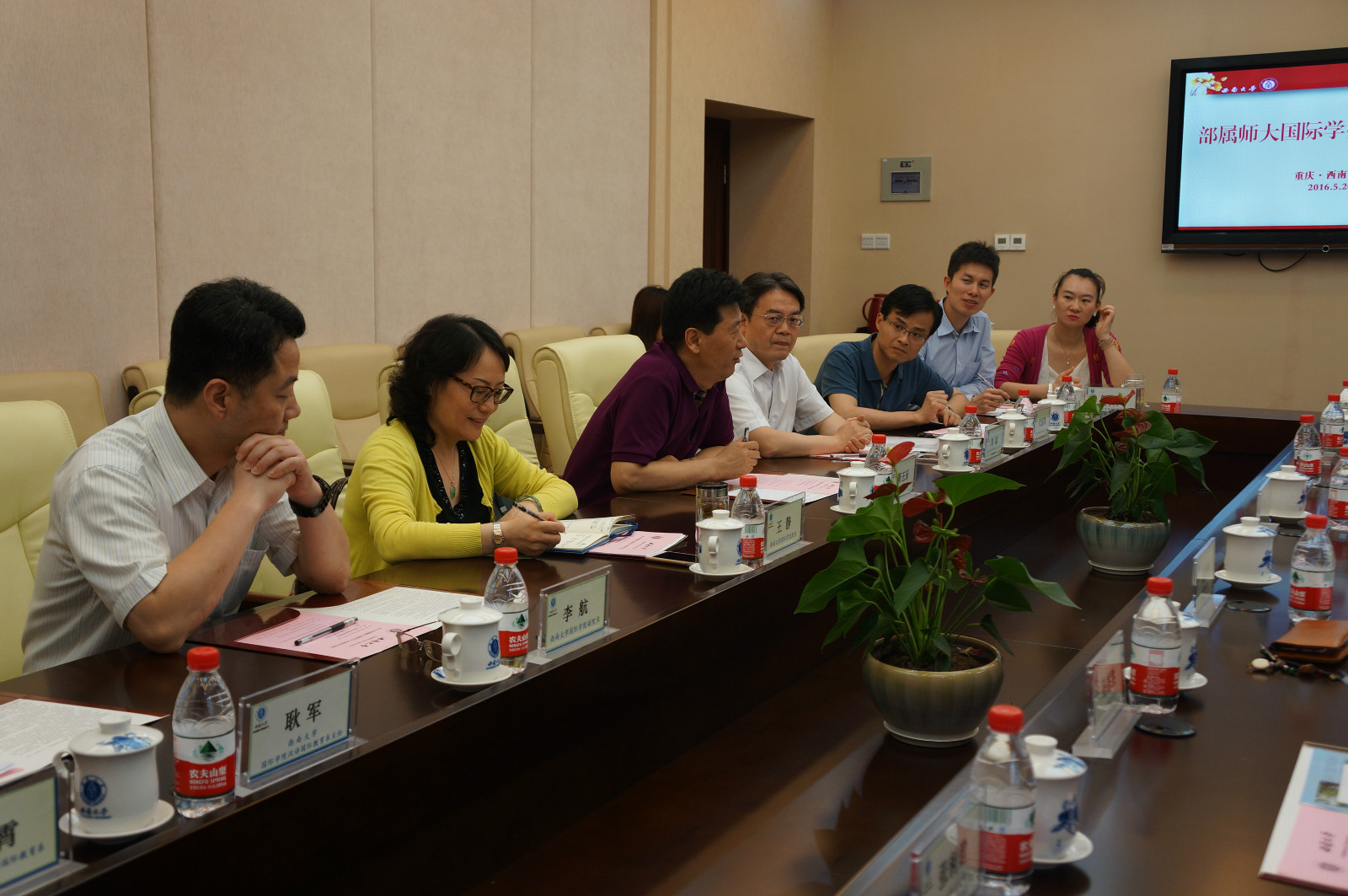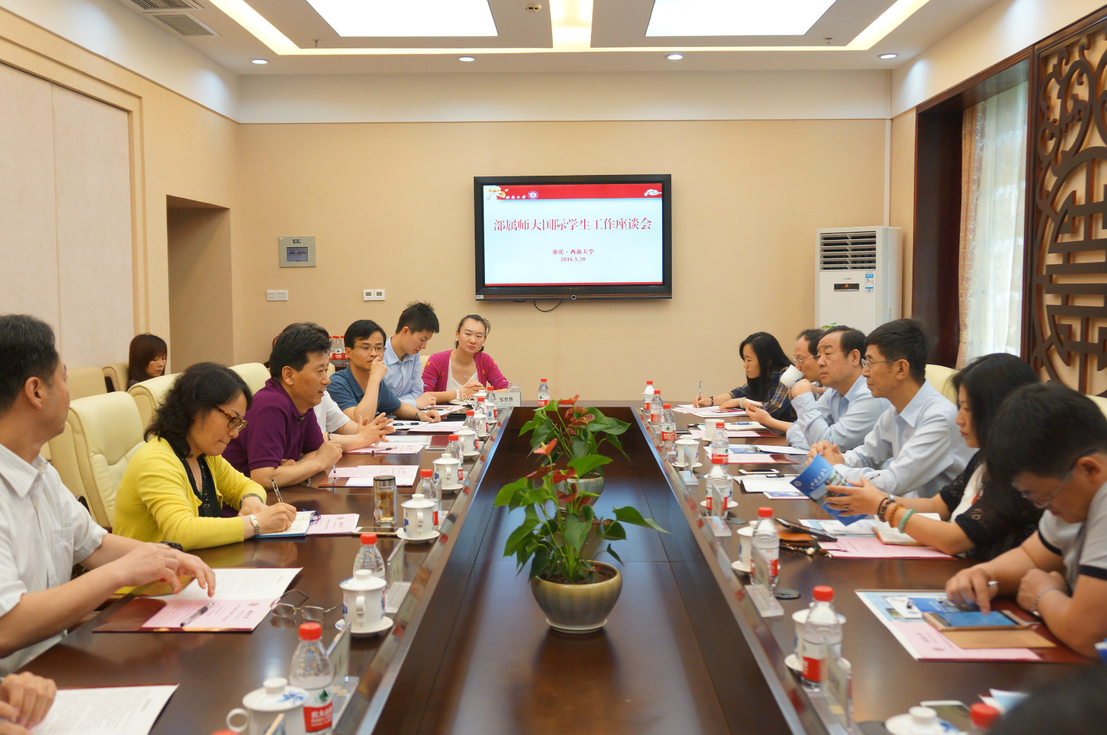 2016年5月20日下午,部属师大国际学生工作座谈会在我校必赢776net签约室举行。中国高教学会外国留学生教育管理分会副会长兼秘书长贺向民,华东师范大学国际教育中心主任黄美旭,陕西师范大学国际汉学院院长张建成,北京师范大学国际合作与交流处副处长艾忻,东北师范大学国际合作与交流处副处长孙德胜,华中师范大学国际文化交流学院副院长周波,必赢776net副校长靳玉乐,必赢776net院长王静、党总支书记刘猛、副院长李航参加了座谈会,会议由必赢776net必赢776net院长王静主持。
