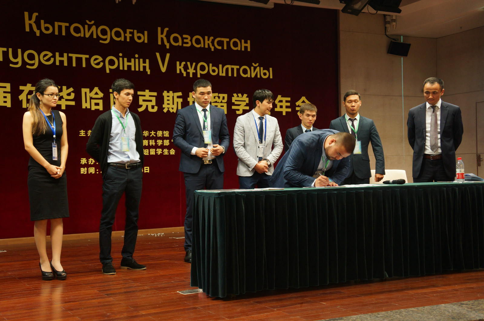 随后,来自北京、上海、广州、武汉、西安、乌鲁木齐以及重庆的哈萨克斯坦留学生代表纷纷上台发言,针对在华学习、生活等诸多方面进行了深入的探讨并在支持年会的协议上签下了自己的名字。年会在参会领导与哈萨克斯坦留学会代表的合影中圆满落幕。