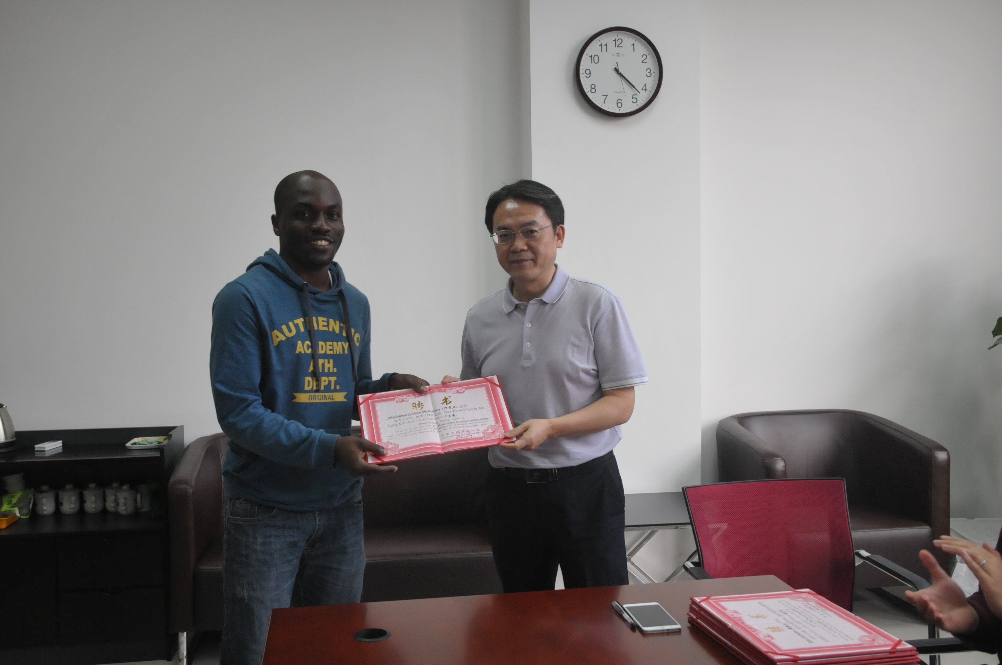 10月19日下午,学校2015-2016学年度留学生会新任干部聘书颁发仪式在必赢776net305会议室举行。学院党总支书记兼副院长刘猛,学生工作办公室主任陈雨曦、杨昆参加仪式。