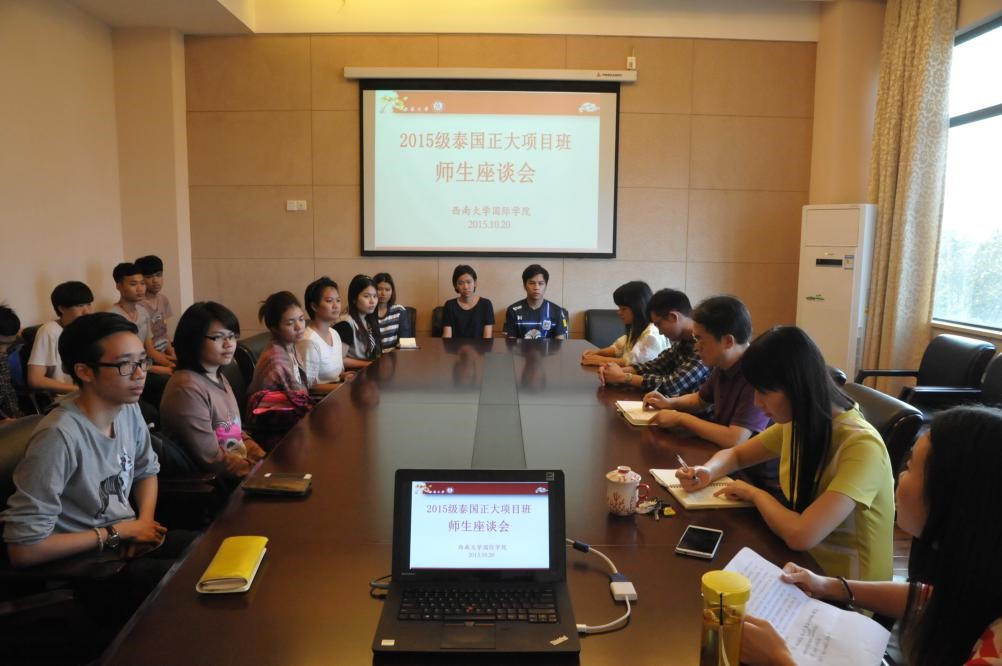 2015年10月20日下午3点,2015级泰国正大管理学院"1+1+2"商务汉语本科项目班师生座谈会在学院310会议室举行。总支书记兼副院长刘猛、学工办主任陈雨曦以及教师代表舒敬斌、李真真、李丹和全班16名学生参加座谈。
