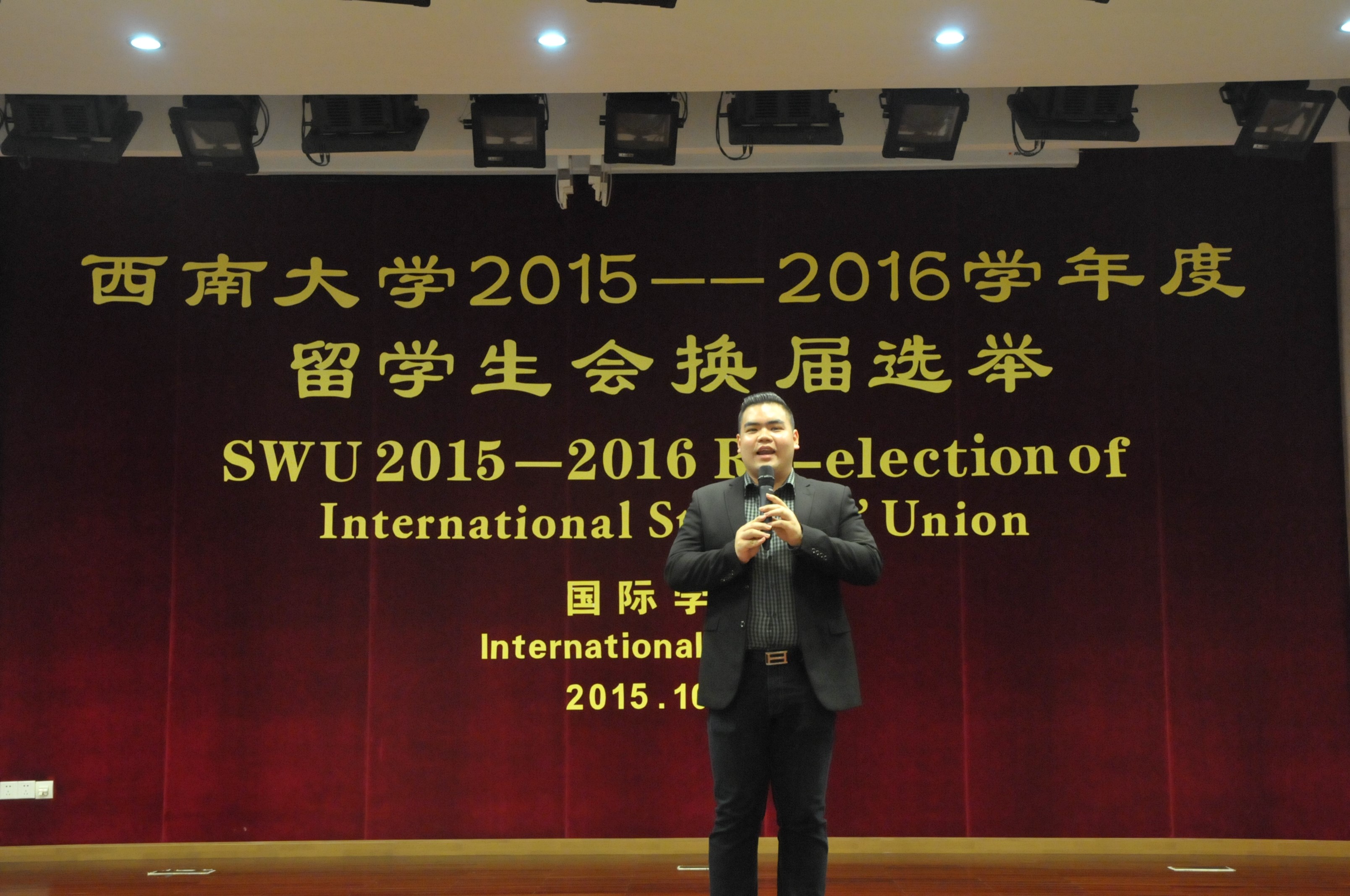 10月10日下午四点,必赢776net2015-2016年度留学生会换届选举大会在紫云楼一楼国际报告厅隆重举行。16名候选人就新一届留学生会的主席、副主席和秘书职位展开竞选,全校400余名留学生参加选举大会。
